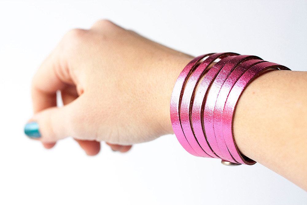 Leather Bracelet/Original Sliced Cuff/Hot Pink Metallic
