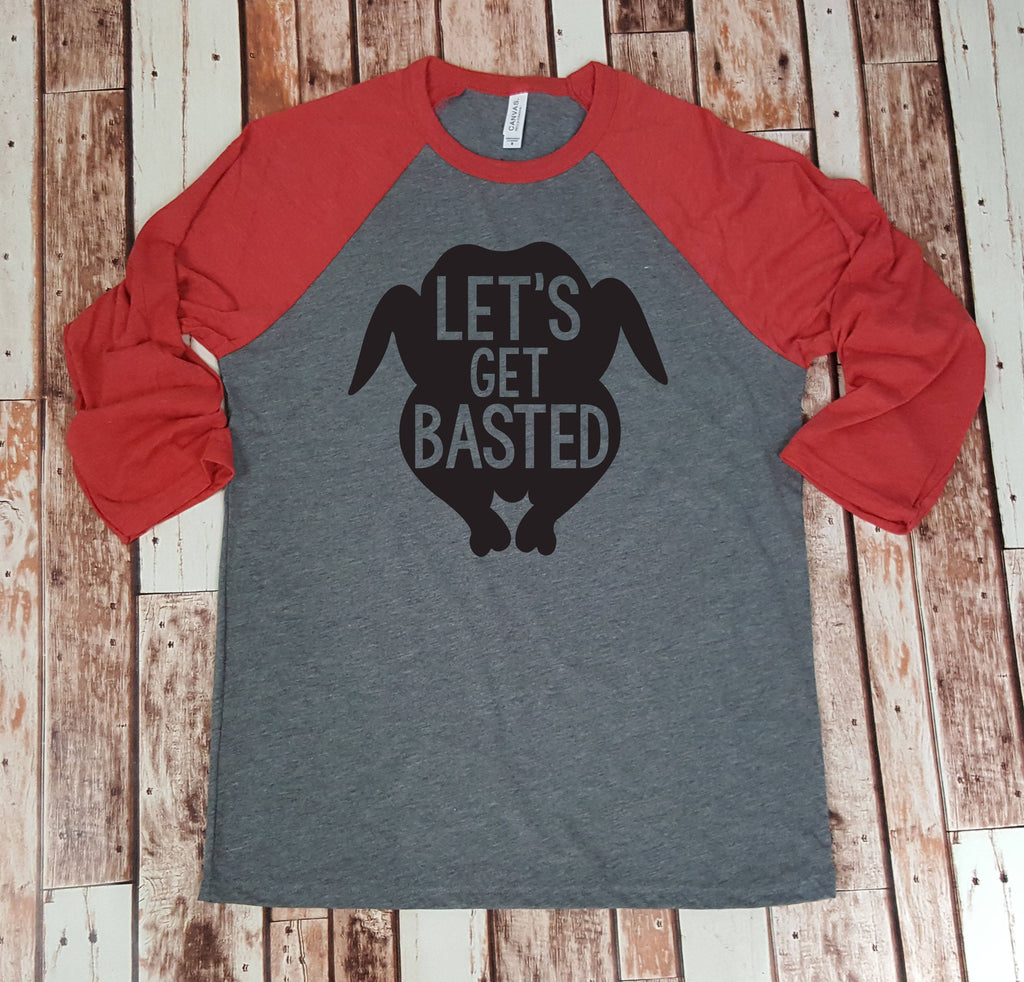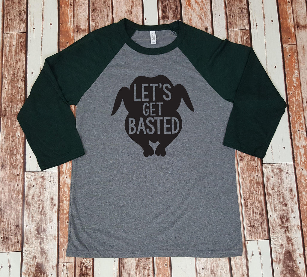 This listing is for (1) tri-blend baseball shirt, as seen in the pictures, that says: "Let's get basted" in the shape of a turkey - Perfect for a Friends-giving celebration!