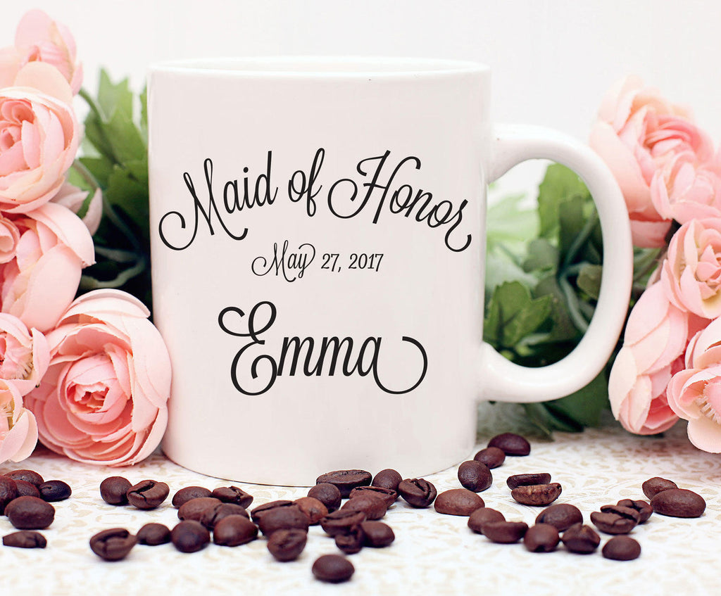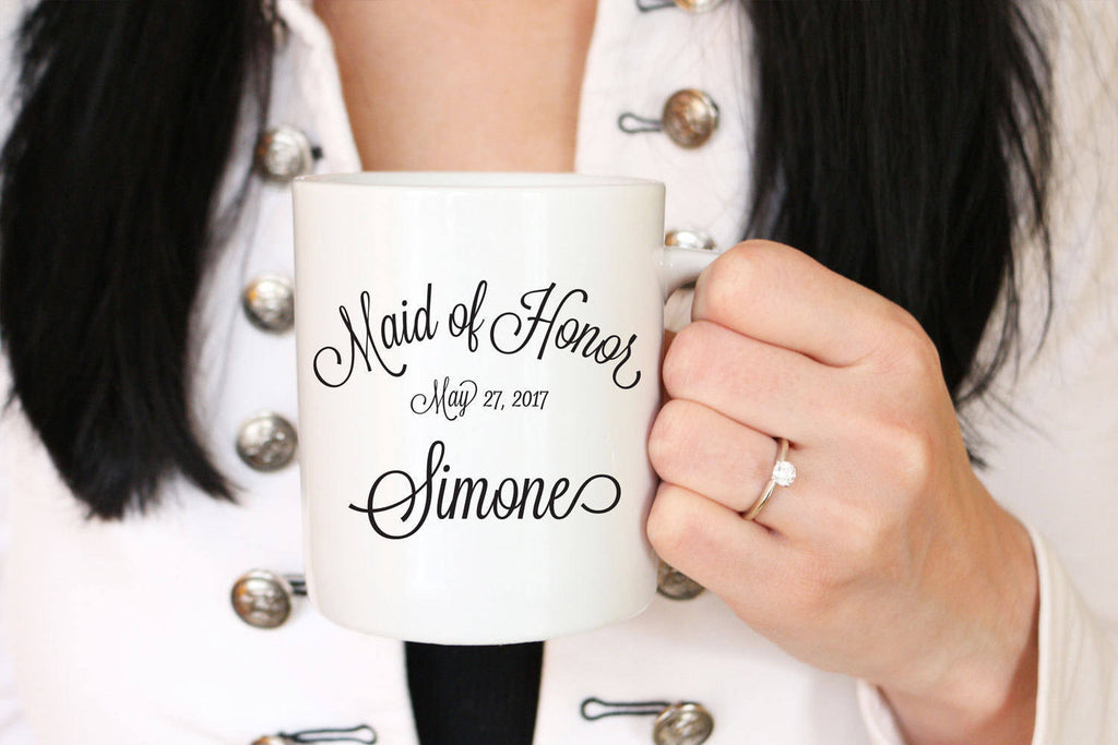 This Maid of Honor mug features an elegant font with the name of the Maid of Honor and the wedding date.