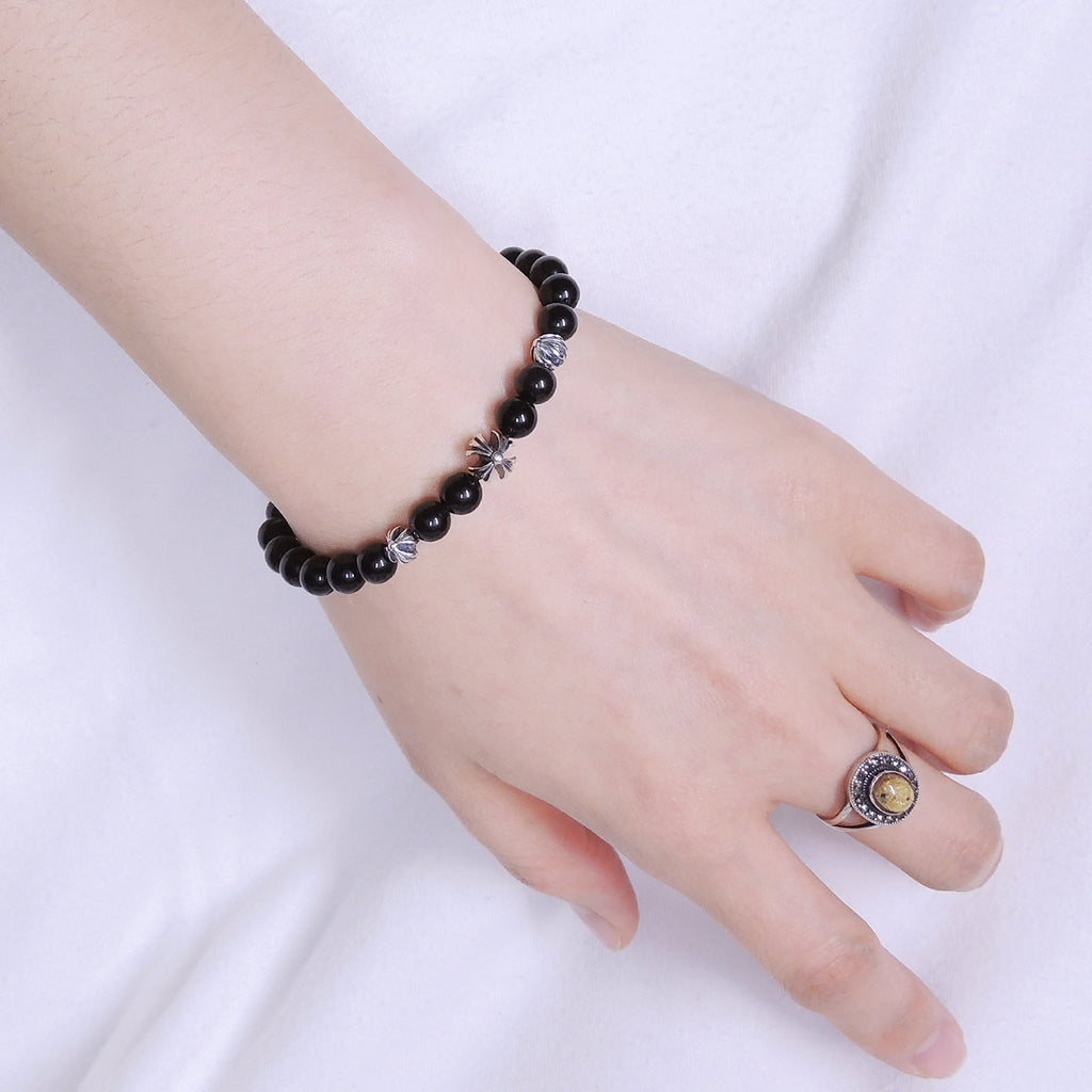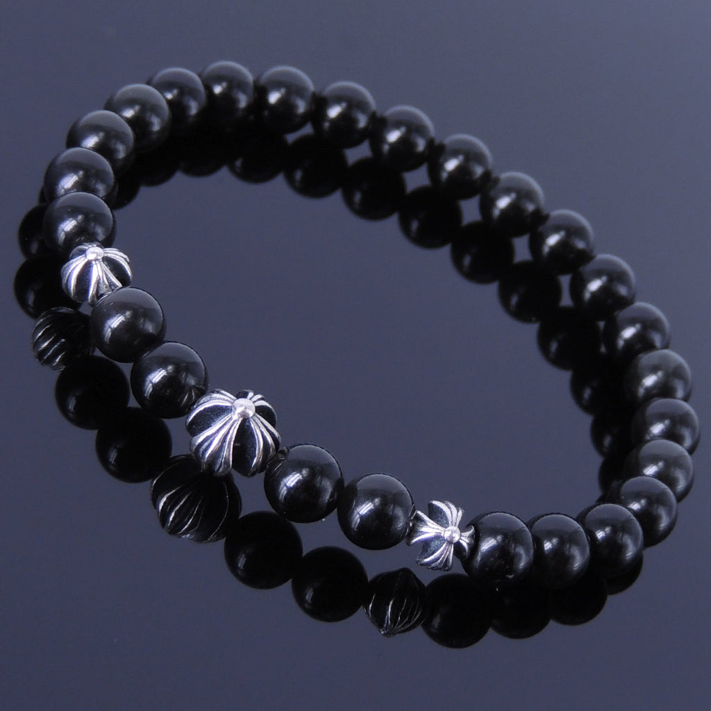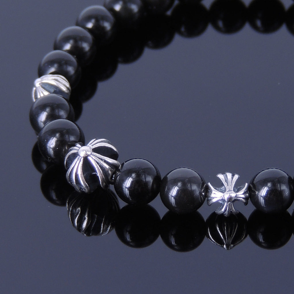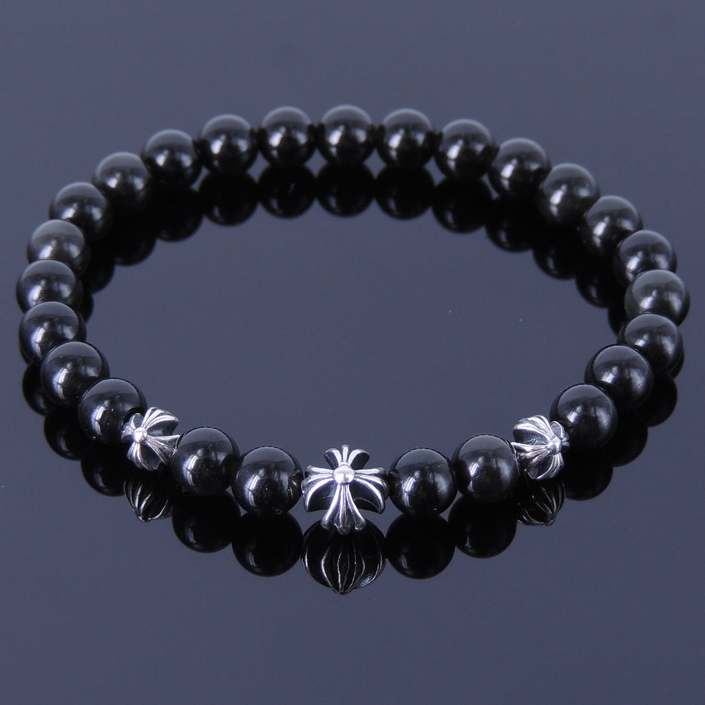 Men Women Black Obsidian Bracelet Gemstone 925 Sterling Silver Celtic Cross Beads DiyNotion BR306