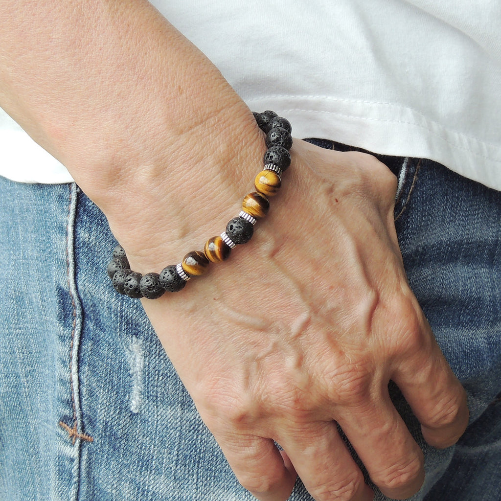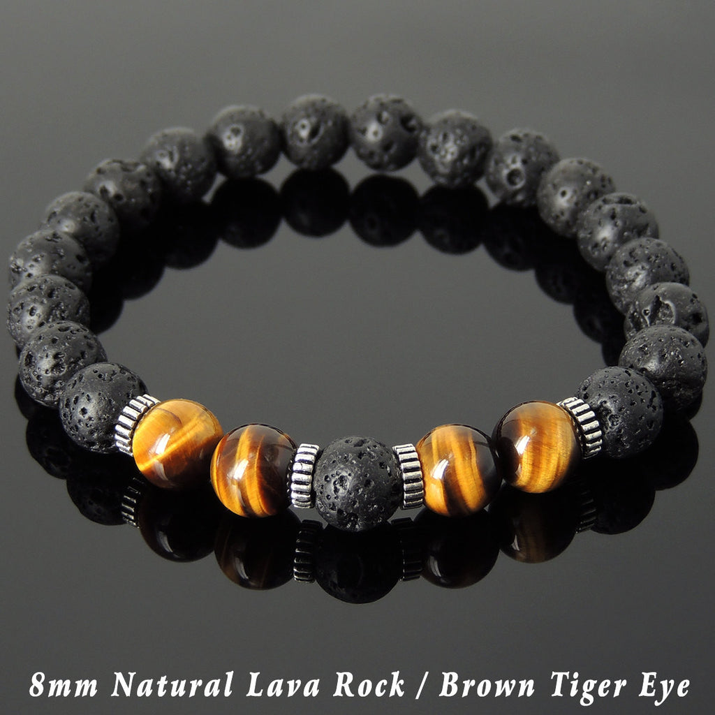 Men Women Lava Rock Brown Tiger Eye Bracelet 925 Sterling Silver Spacers DiyNotion Handmade BR1000