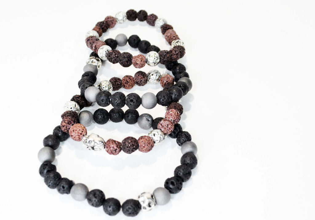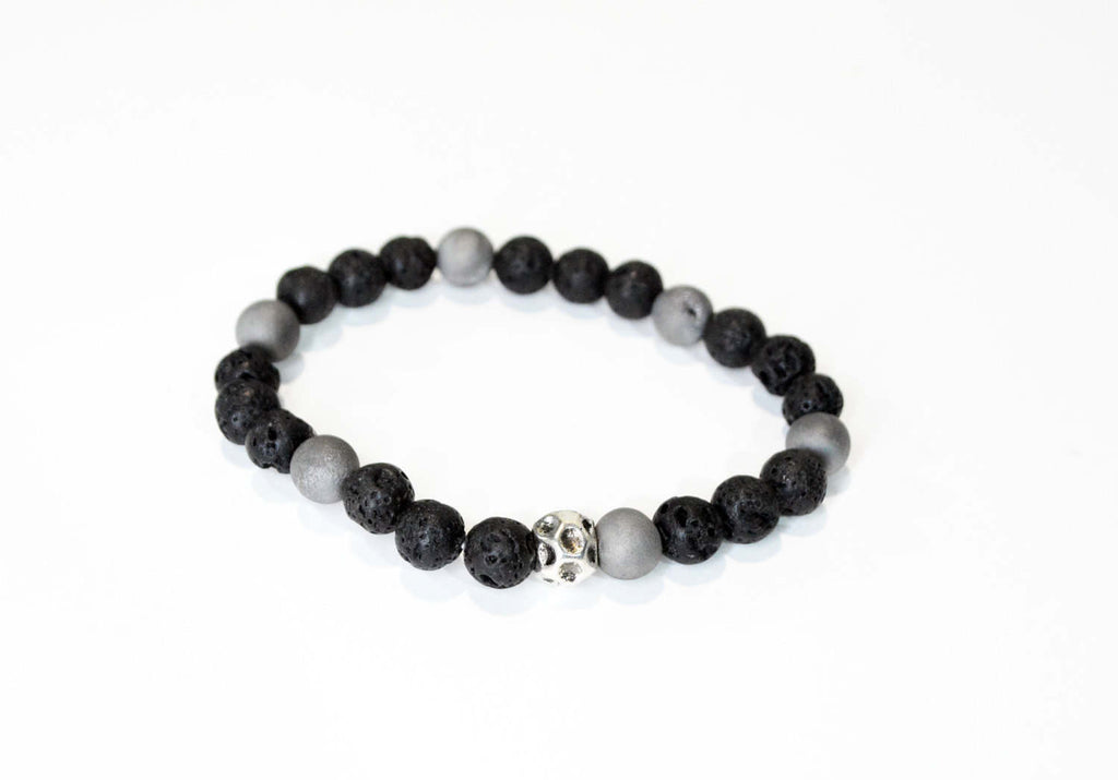 This handmade bracelet has lava stones, one silver plated bead and five plain grey stone beads.
