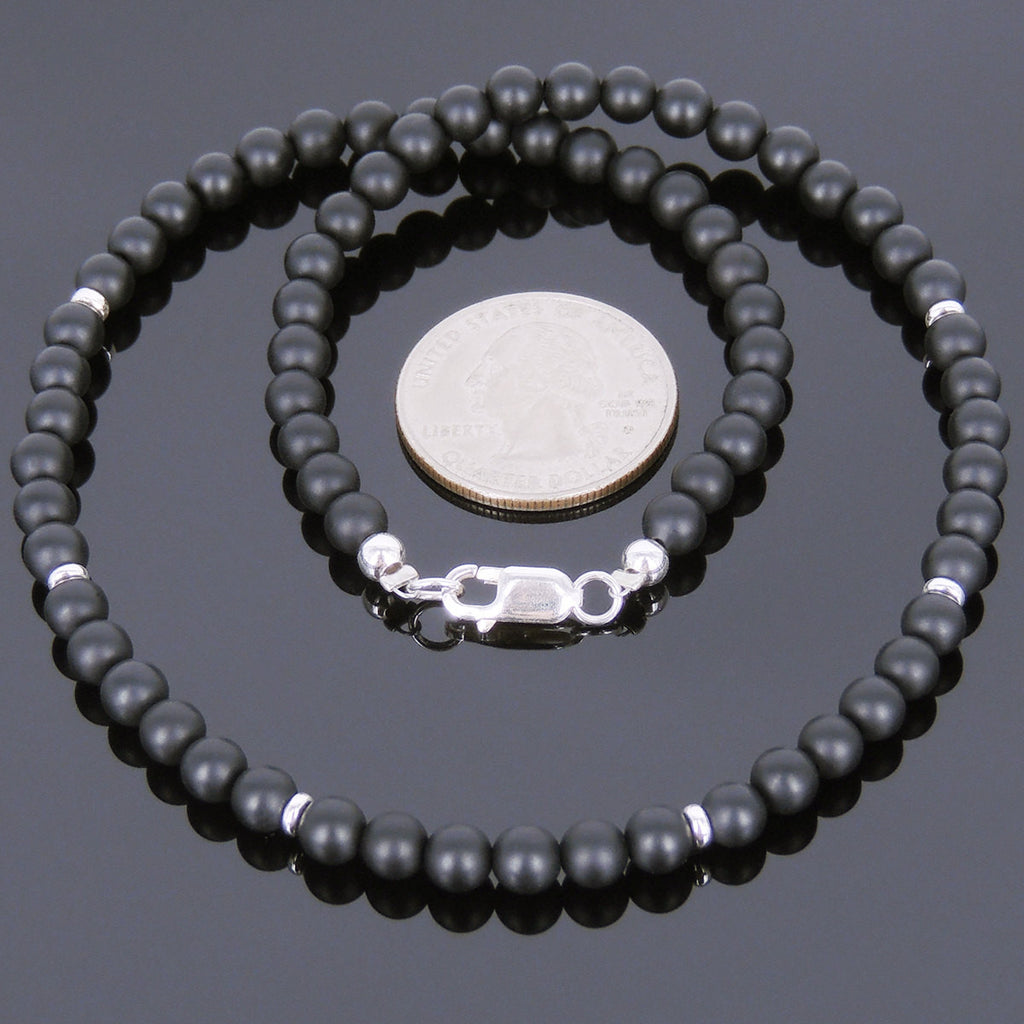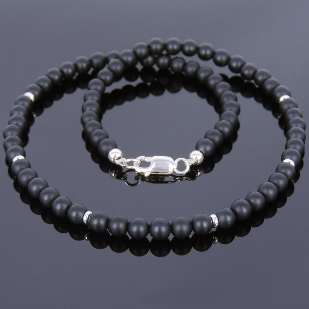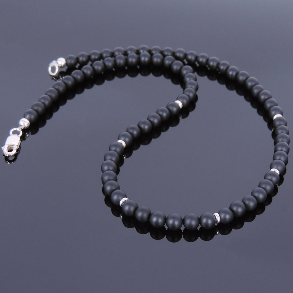 Men's Women 5mm Matte Black Onyx Sterling Silver Necklace Gemstone 925 Spacers Beads Clasp DiyNoion Handmade NK069
