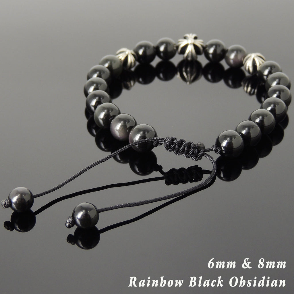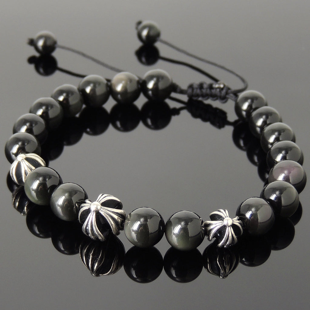 Men's Women Black Obsidian Adjustable Braided Bracelet 925 Sterling Silver Cross Beads DiyNotion BR837