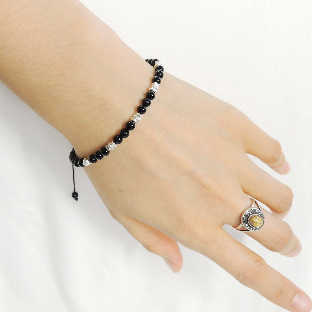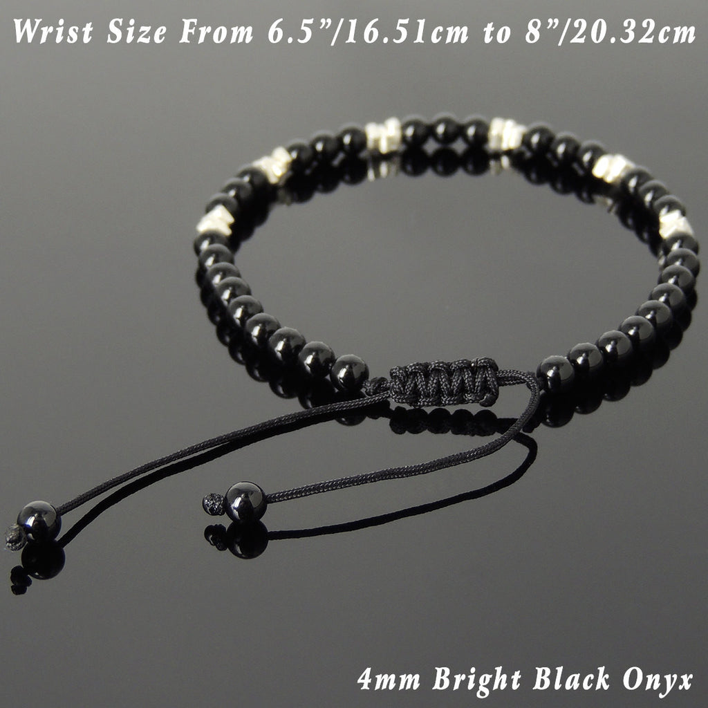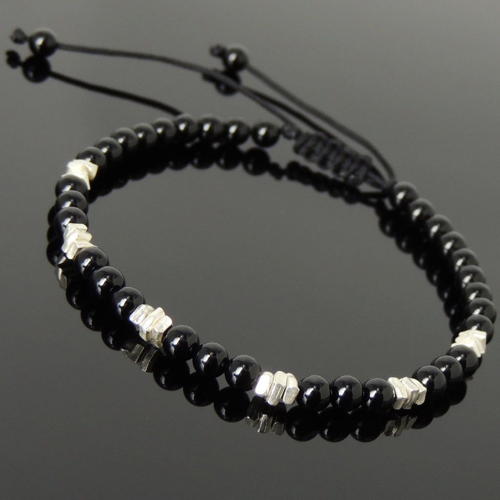 Men's Women Bright Black Onyx Adjustable Braided Bracelet 925 Sterling Silver Nugget Beads DiyNotion BR959