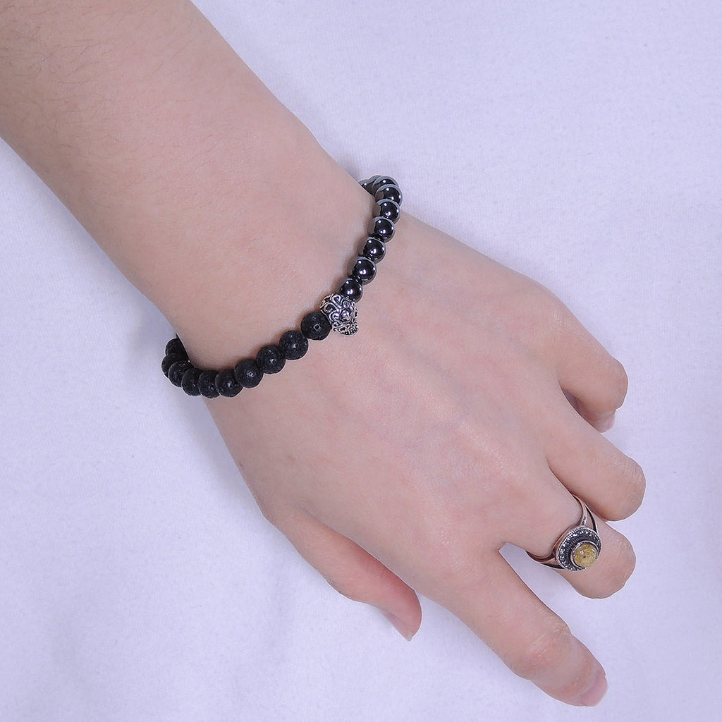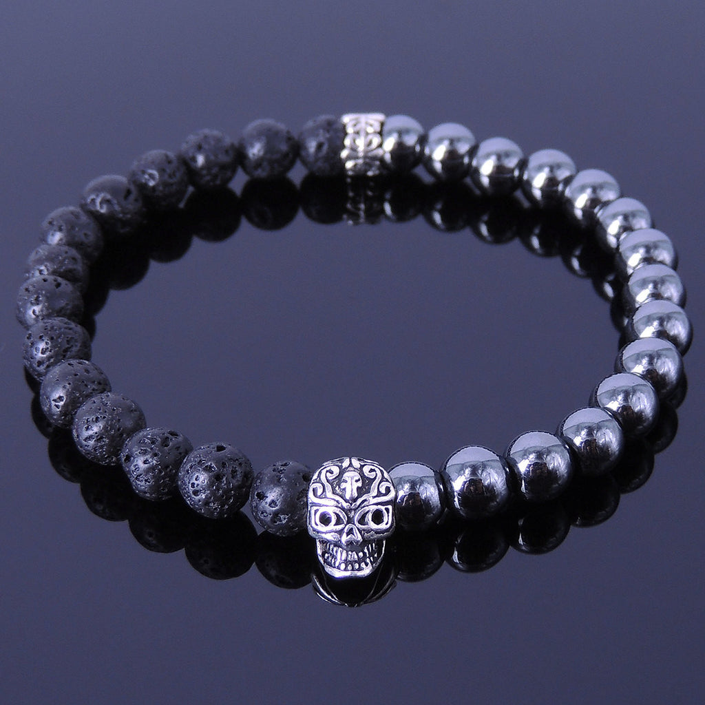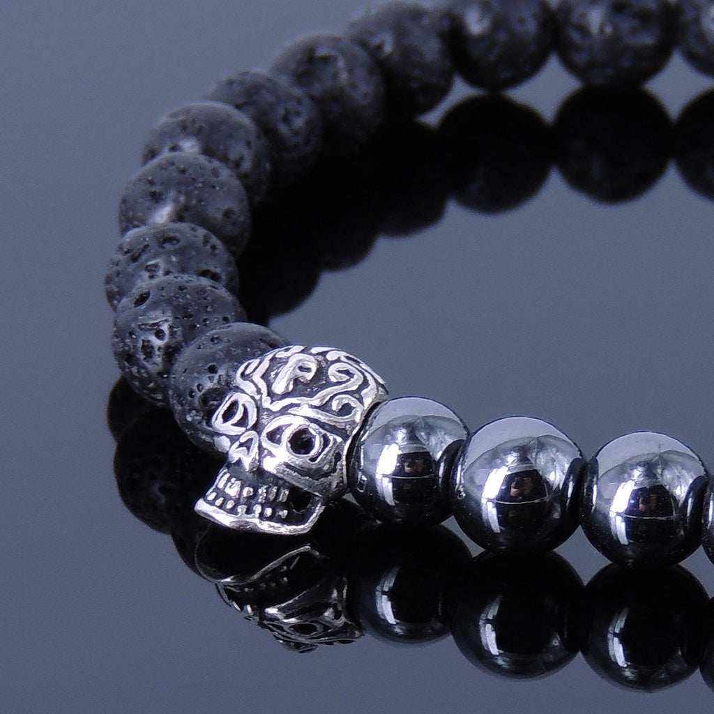 Men's Women Hematite Lava Rock Bracelet 925 Skull & Fleur de Lis Spacer DiyNotion Handmade BR319