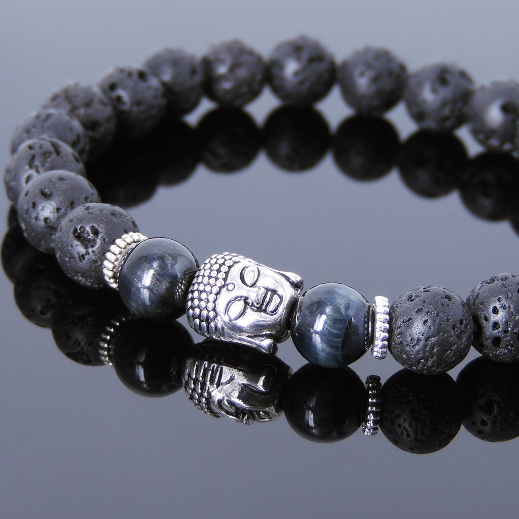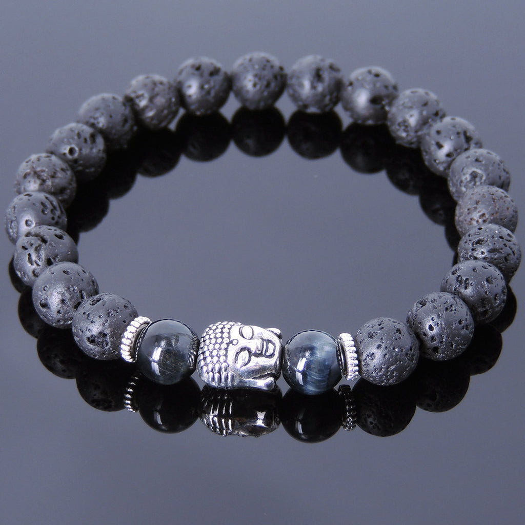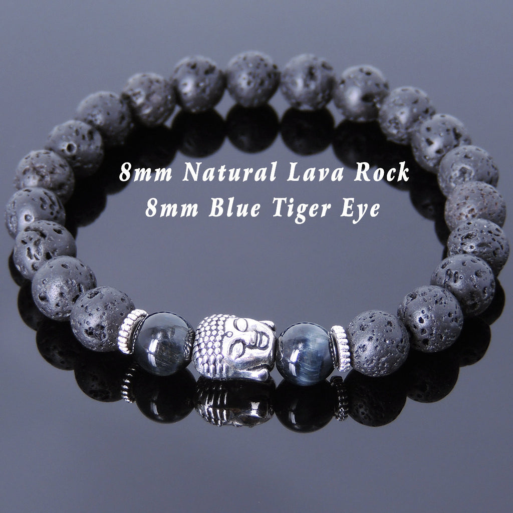Men's Women Lava Rock Blue Tiger Eye Tibetan Silver Bracelet Sakyamuni Buddha Yoga Mala DiyNotion Handmade T157