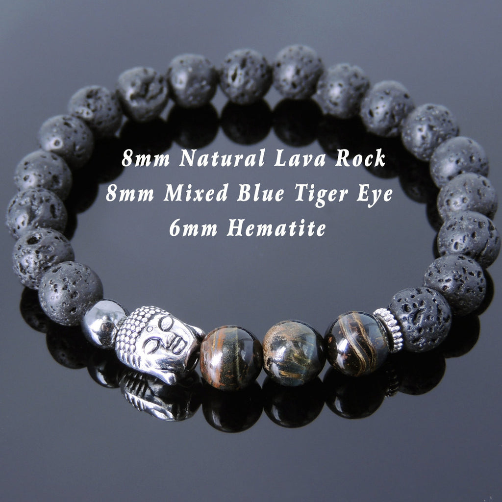 Materials: Lava Rock,Mixed Blue Tiger Eye,Hematite,Tibetan Silver,Elastic Cords