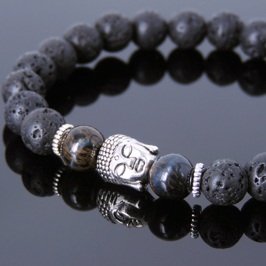 Materials: Lava Rock,Rare Mixed Blue Tiger Eye,Tibetan Silver,Elastic Cords