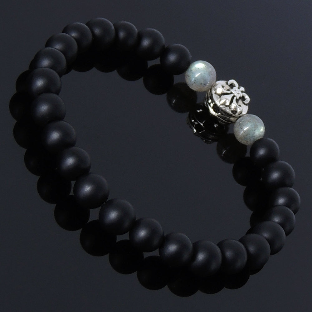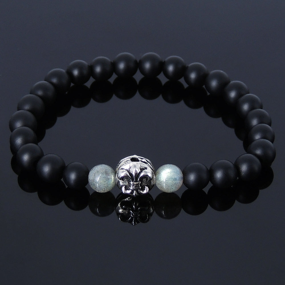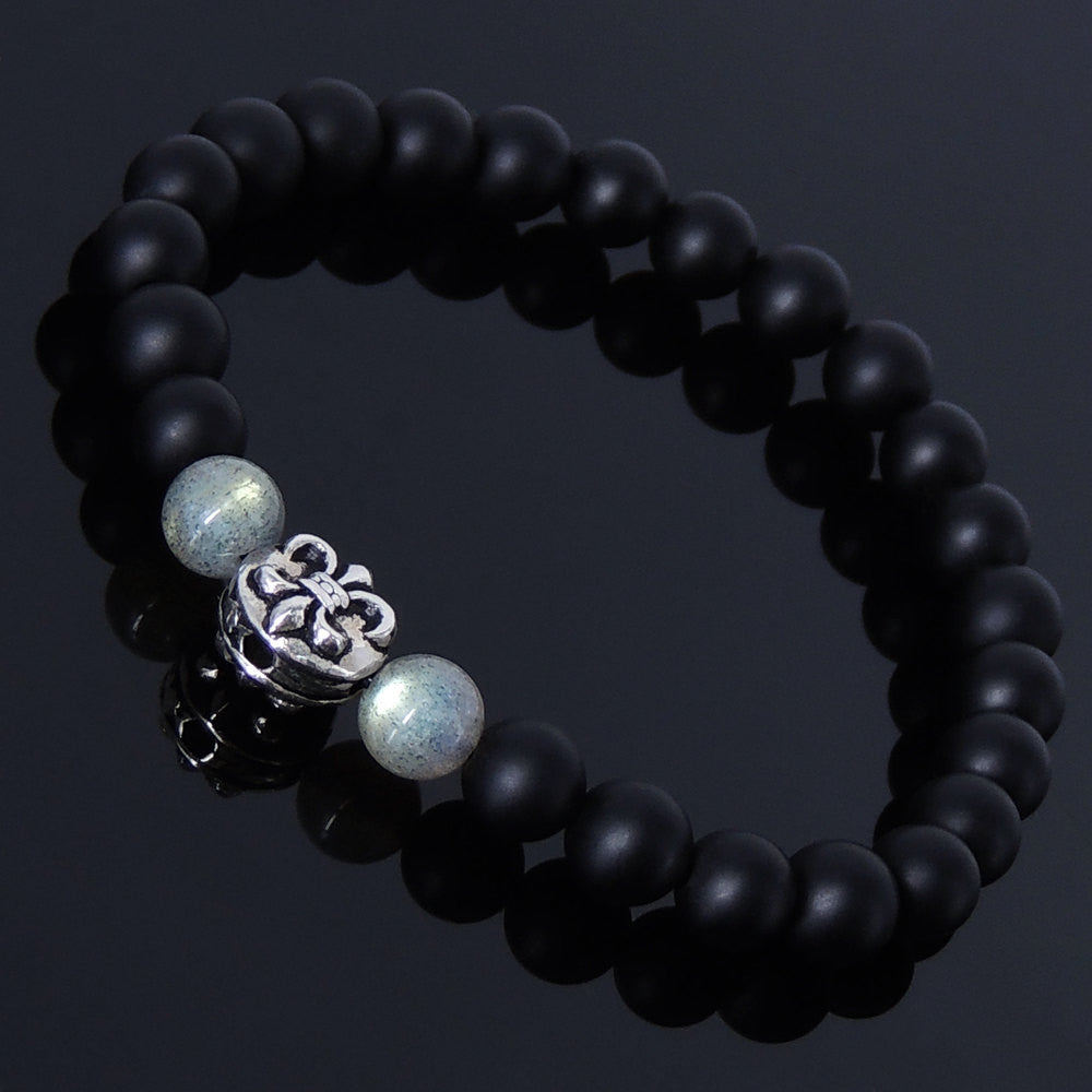 Men's Women Matte Black Onyx Labradorite Sterling Silver Bracelet 925 Fleur de Lis Bead DiyNotion Handmade BR233