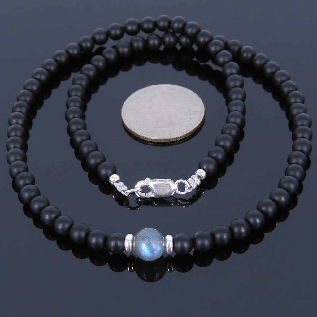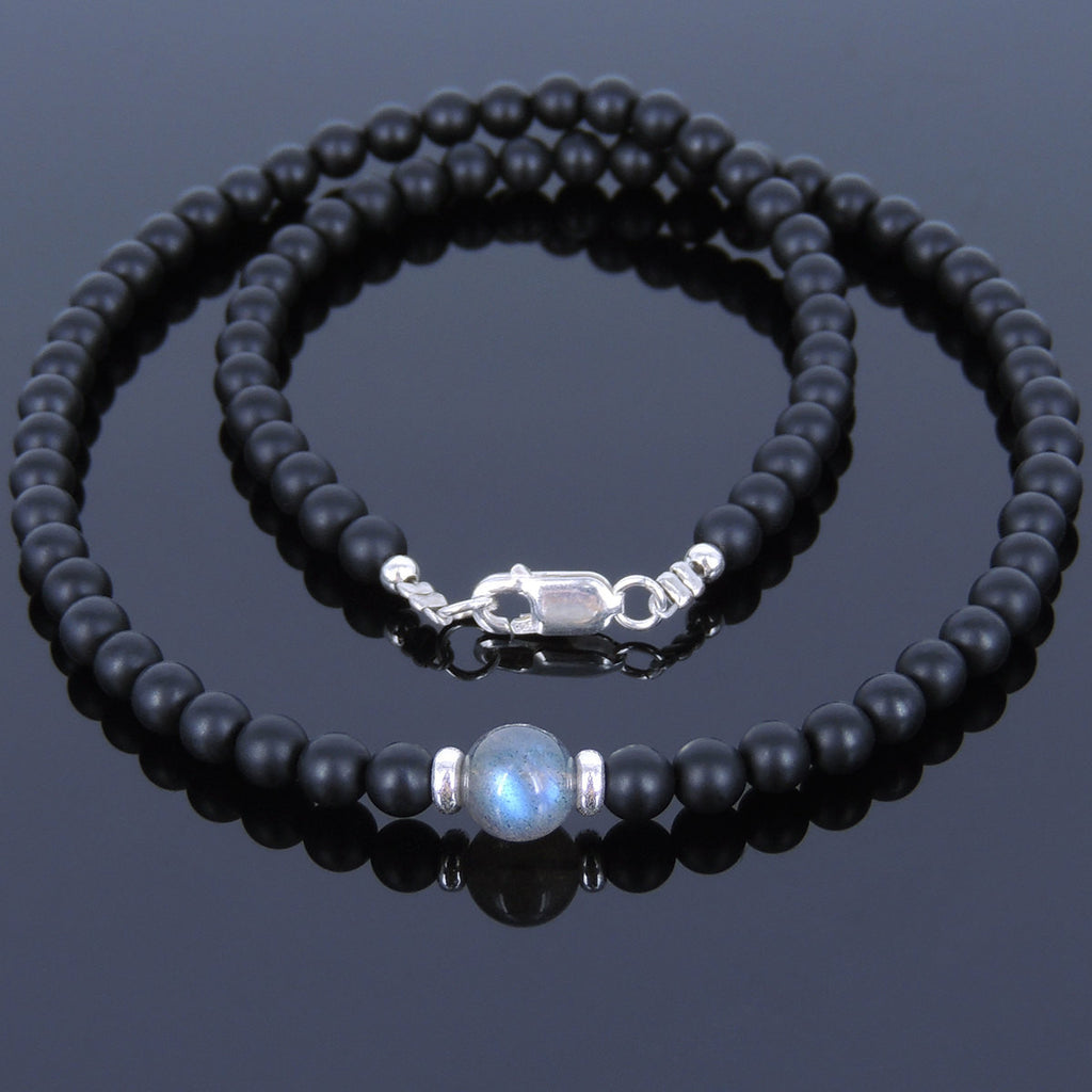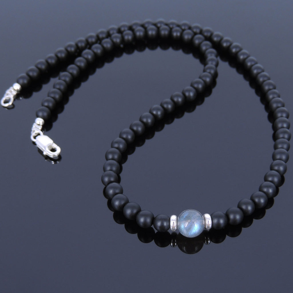 Men's Women Matte Black Onyx Labradorite Sterling Silver Necklace Gemstone 925 Spacers Clasp DiyNoion Handmade NK033