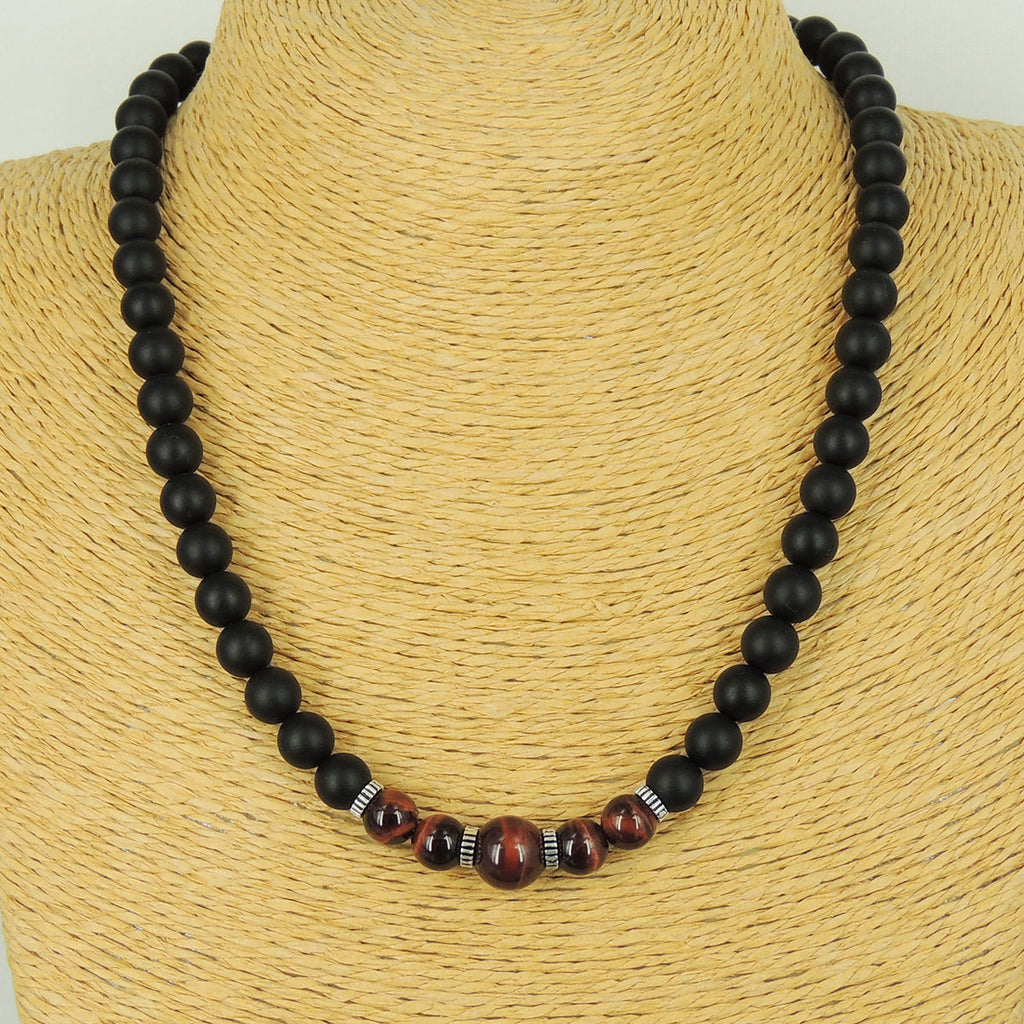 Men's Women Matte Black Onyx Red Tiger Eye Necklace 925 Sterling Silver Spacers Clasp DiyNotion Handmade NK164