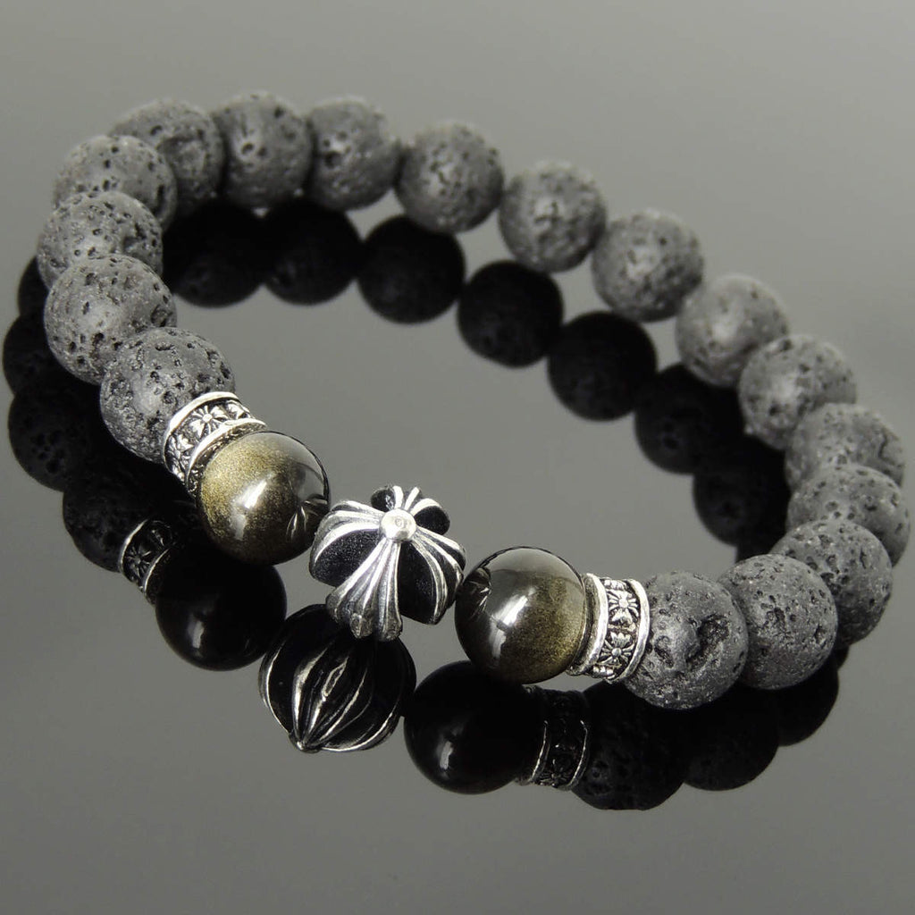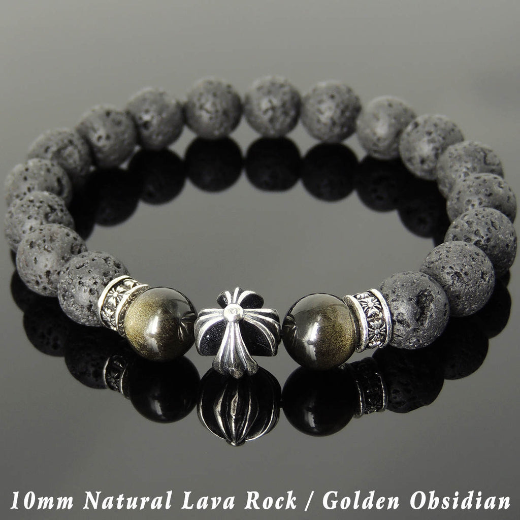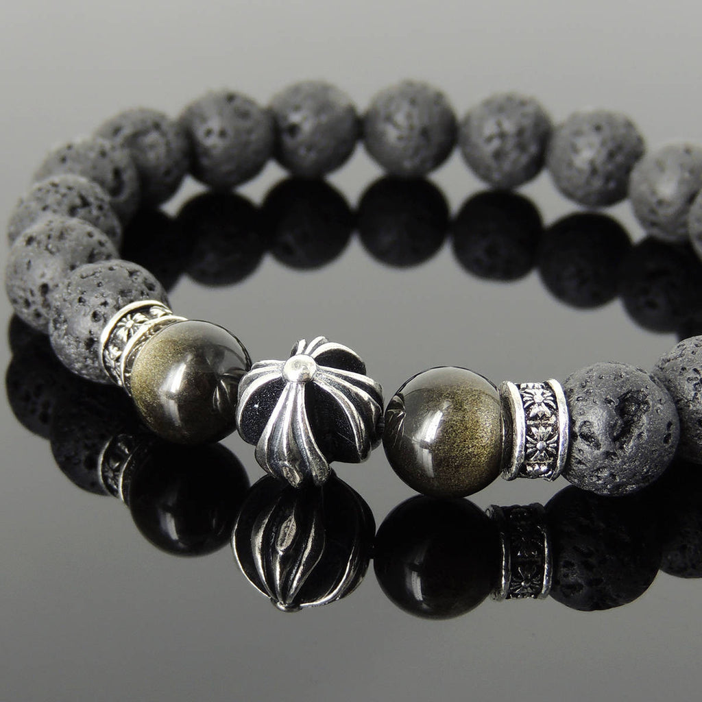 Men's Women Natural Lava Rock Golden Obsidian Bracelet 925 Sterling Silver Cross Bead & Spacers DiyNotion BR1104