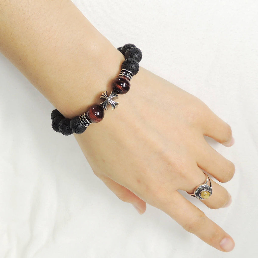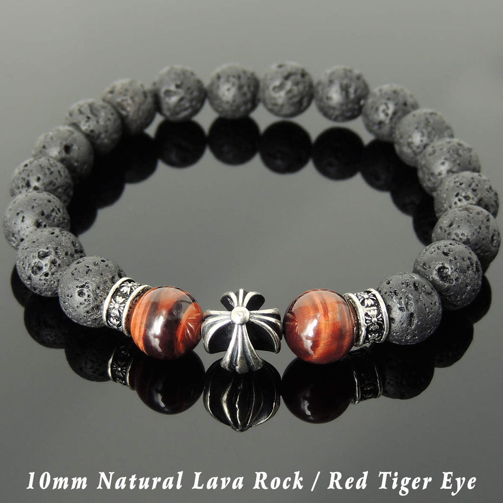 Men's Women Natural Lava Rock Red Tiger Eye Bracelet 925 Sterling Silver Cross Bead & Spacers DiyNotion BR1103