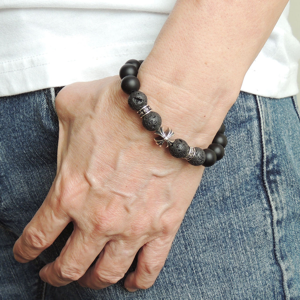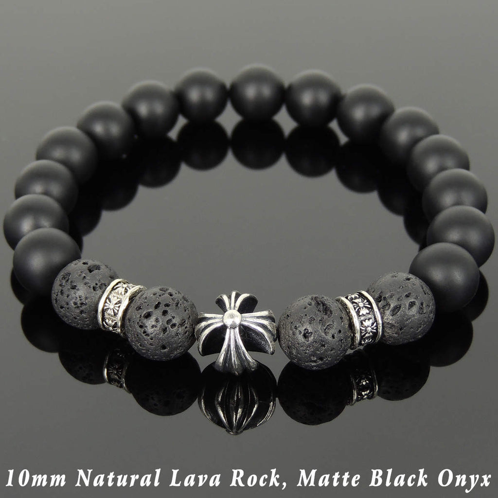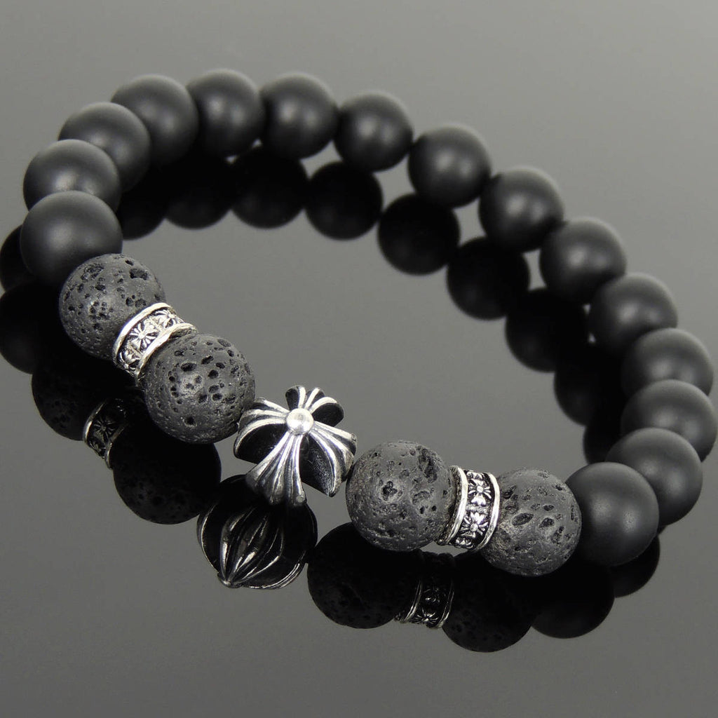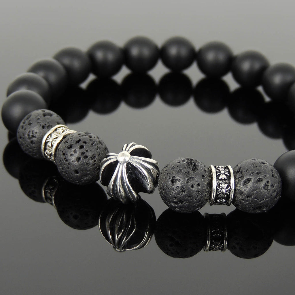 Men's Women Natural Matte Black Onyx Lava Rock Bracelet 925 Sterling Silver Cross Bead & Spacers DiyNotion BR1107
