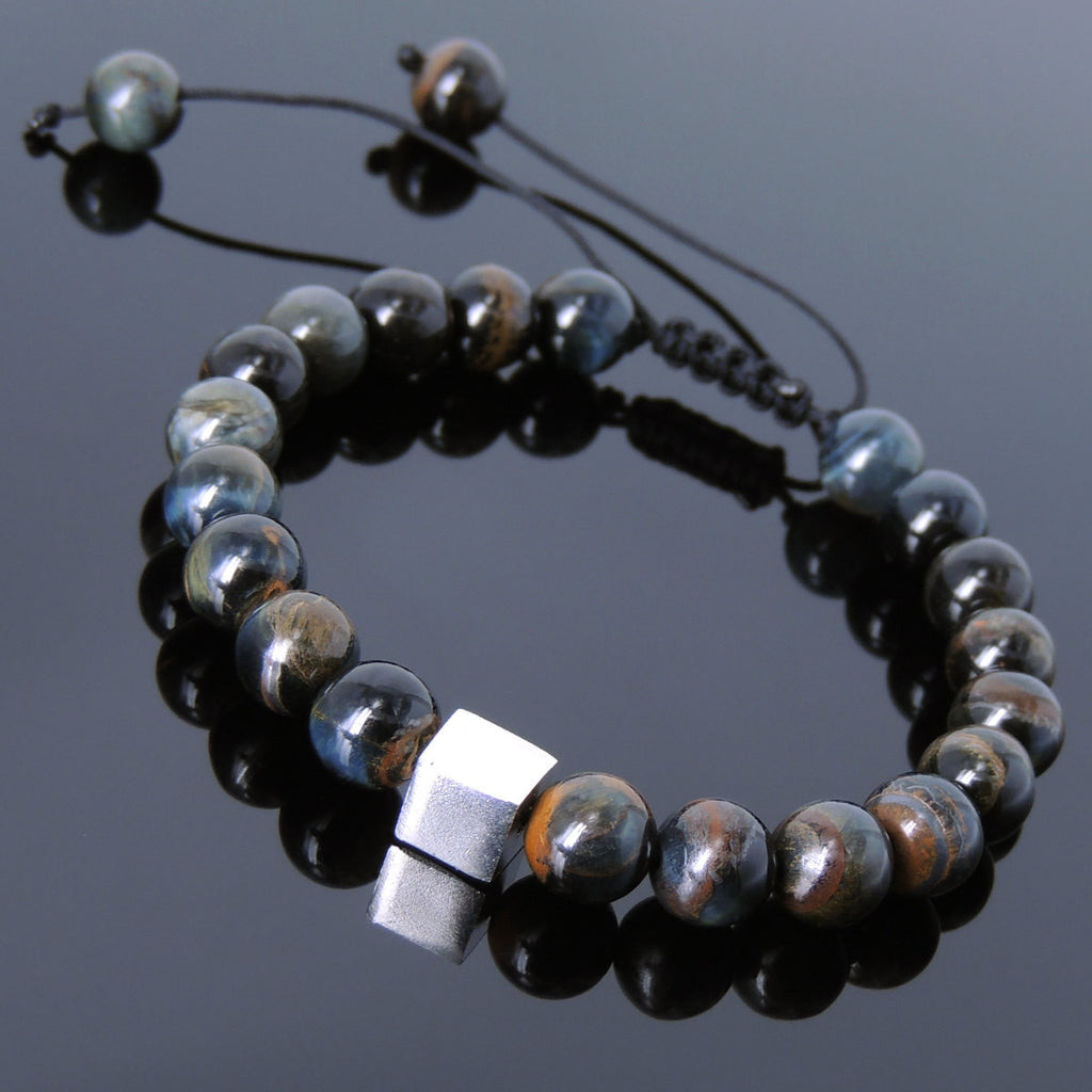 Men's Women Rare Mixed Blue Tiger Eye Adjustable Braided Bracelet 925 Sterling Silver Cube Bead DiyNotion BR803