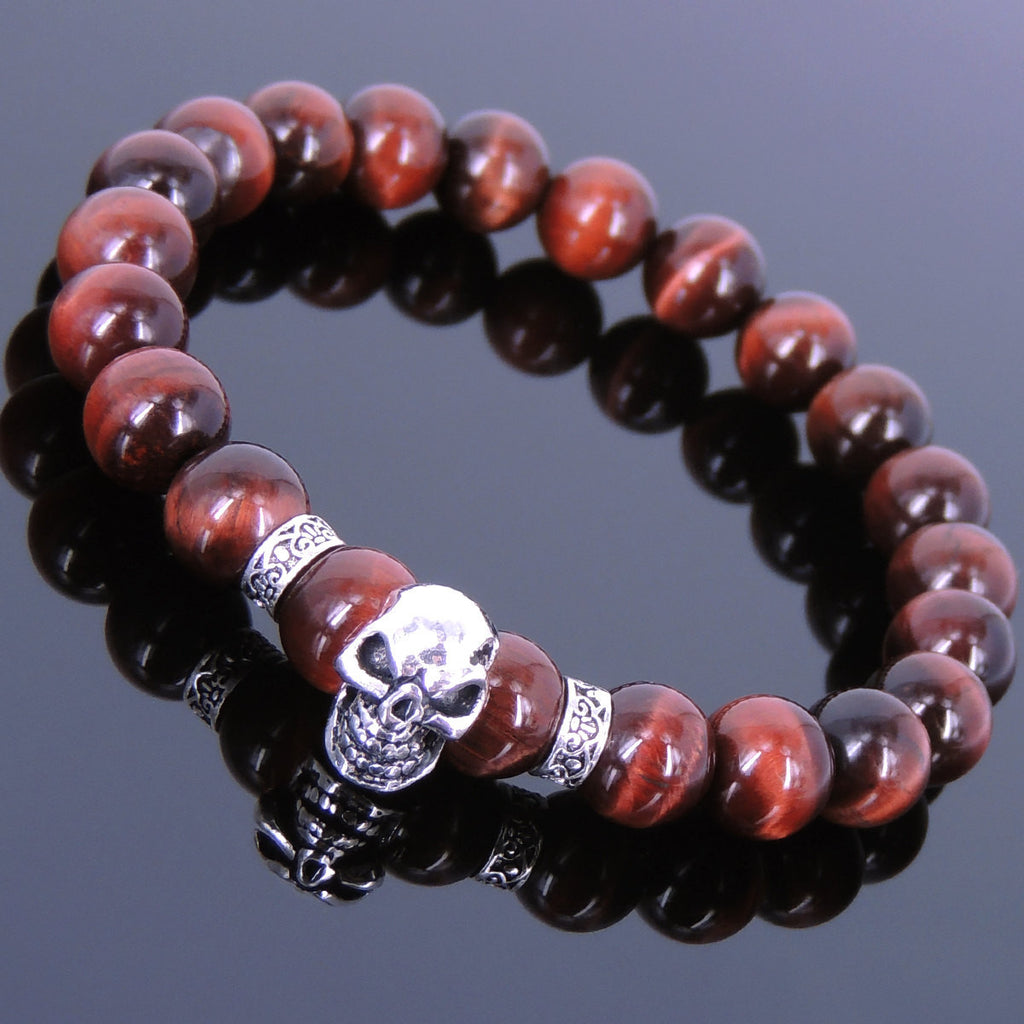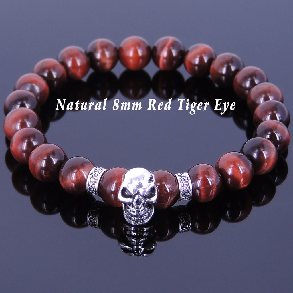 Men's Women Red Tiger Eye 925 Sterling Silver Skull Bracelet DiyNotion Handmade BR352E