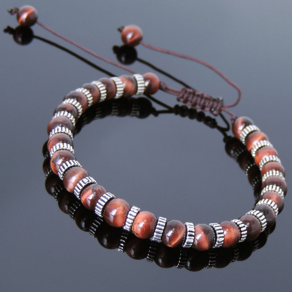 Men's Women Red Tiger Eye Adjustable Braided Bracelet 925 Sterling Silver Spacers DiyNotion BR853
