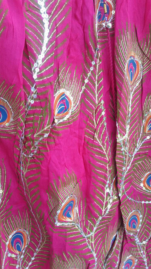 The radiant colors look rich with the classy golden Peacock print. You can casually wear this for evening walk, beach walk, vacation, beach parties, ethnic parties and much more. Made of 100% Rayon and suits all seasons. The intricately stitched sequins are the highlights here.