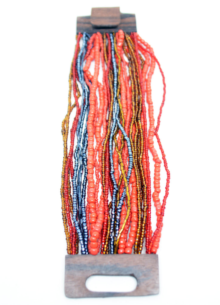 Unique stretchy style beaded bracelet with unique wood clasp at the end. Metallic grey, coral red and brown, multi strand beaded bracelet, with a square wooden buckle clasp.