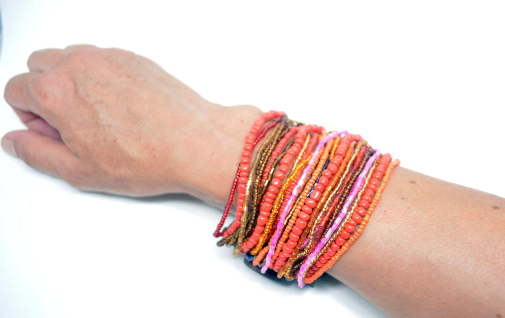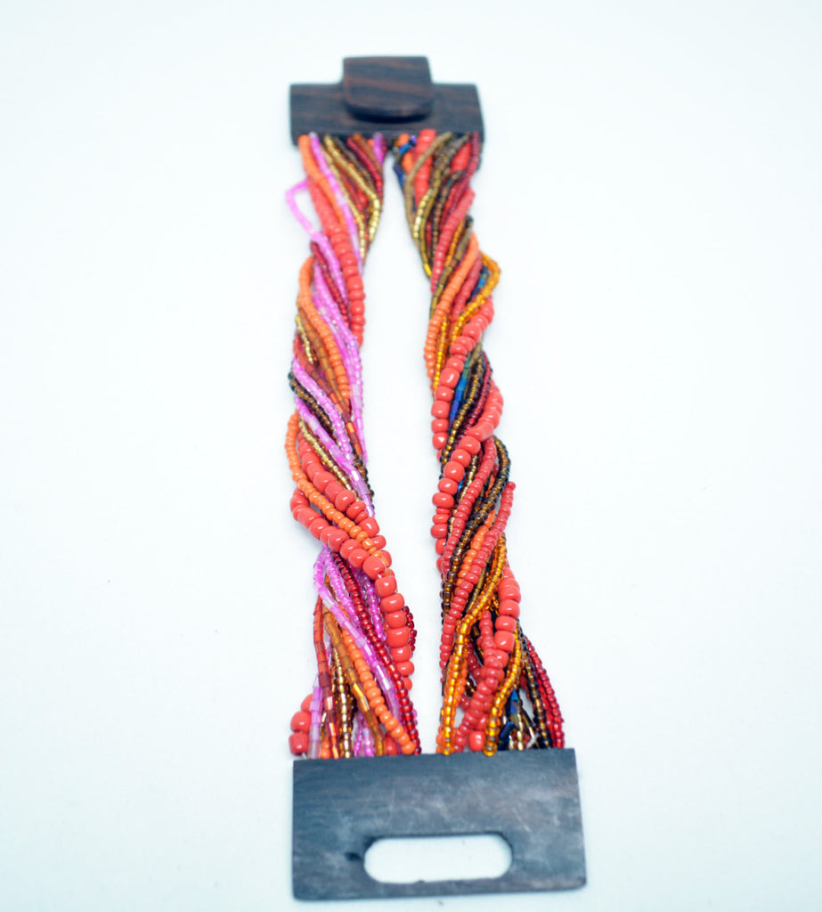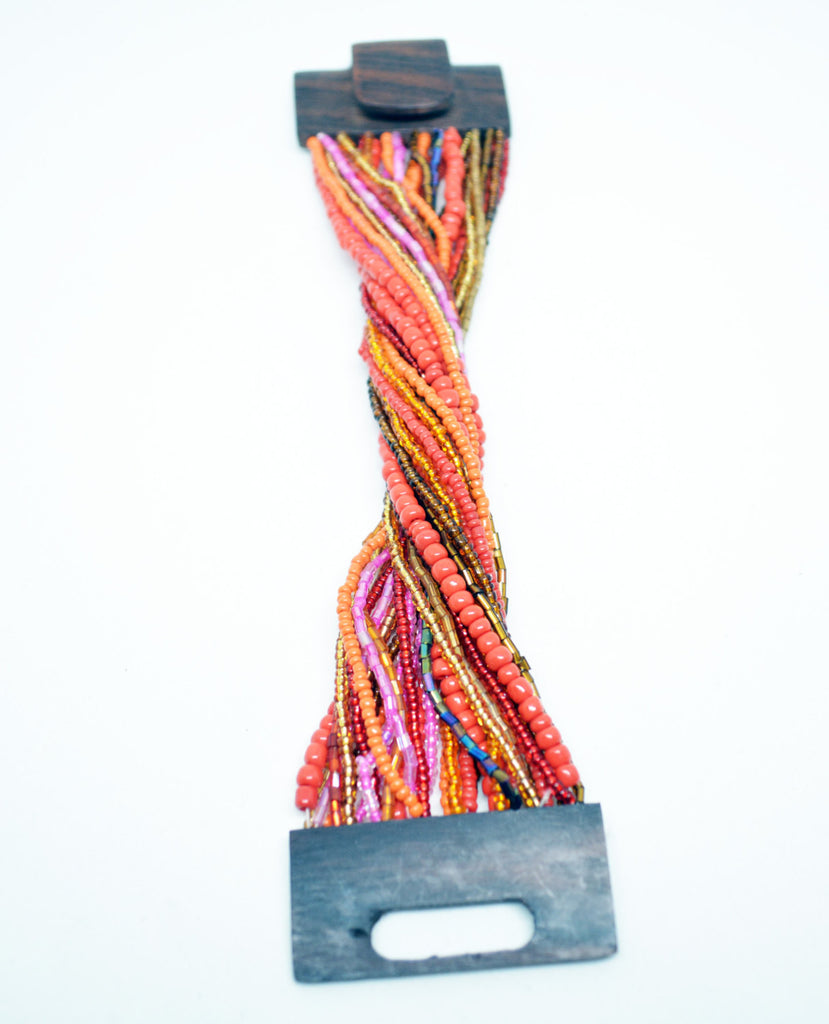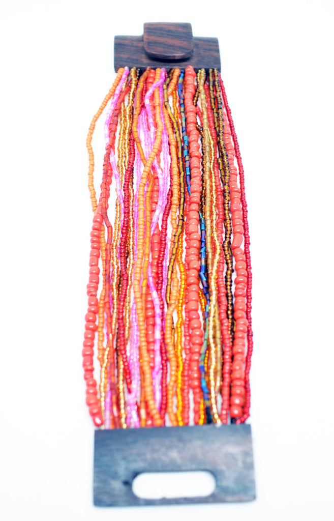 Unique stretchy style beaded bracelet with unique wood clasp at the end. Metallic grey, coral red and brown, multi strand beaded bracelet, with a square wooden buckle clasp.