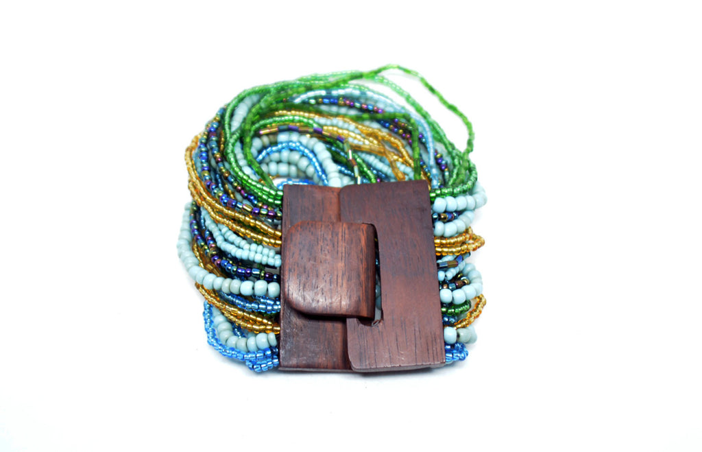 Multi Strand Beaded Bracelet Wooden Clasp Bracelet Turquoise Green Boho Bracelet Gypsy Wood Jewelry Gift for Her