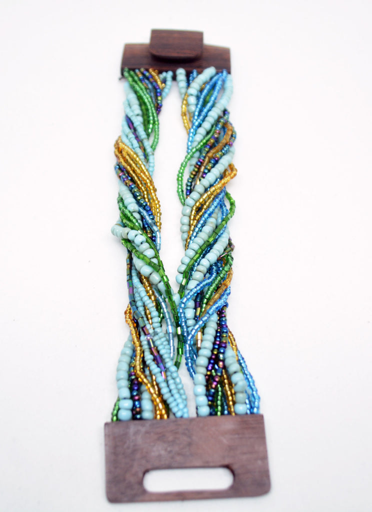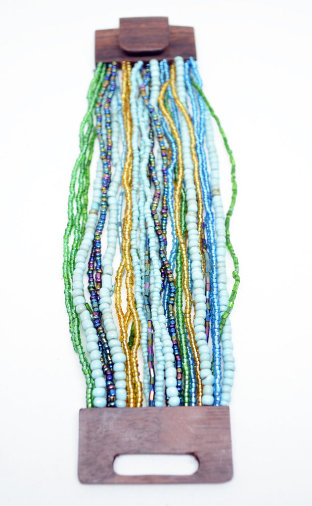 Unique stretchy style beaded bracelet with unique wood clasp at the end. Metallic green, grey, golden and turquoise multi strand beaded bracelet, with a square wooden buckle clasp.
