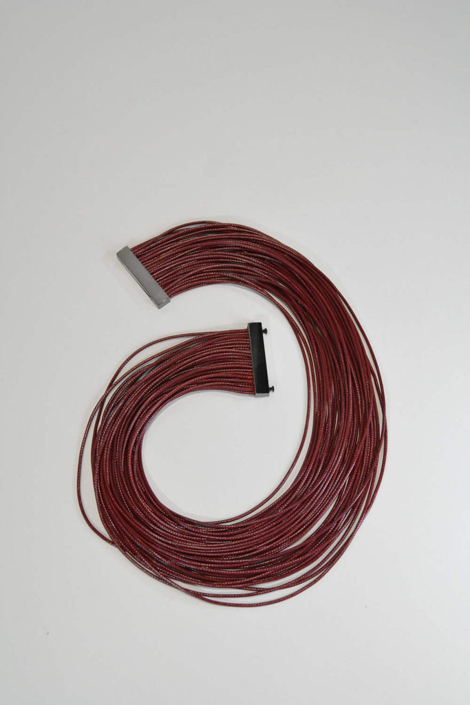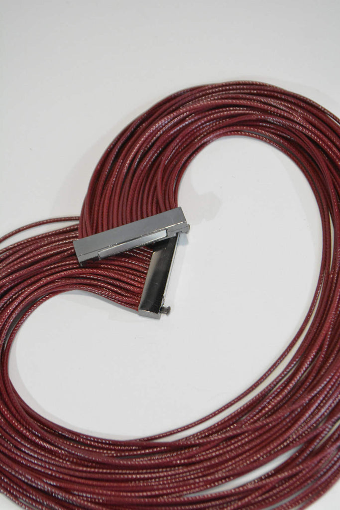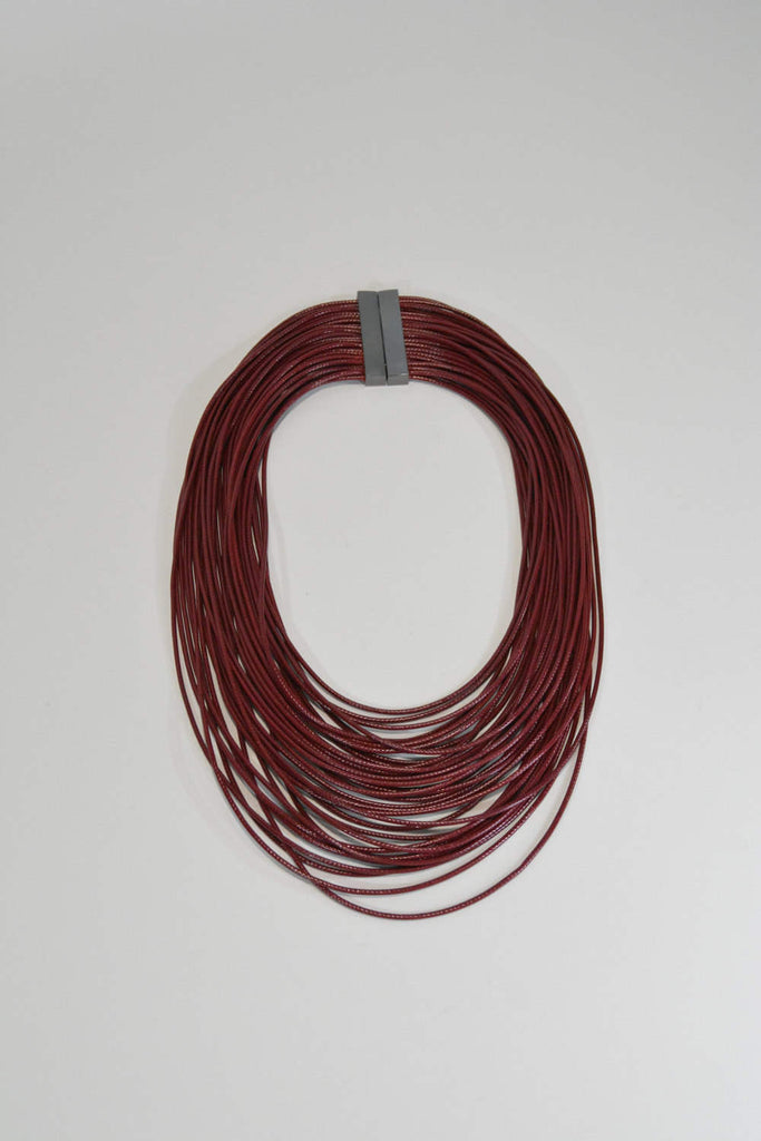 This is a 36 strand layered cotton cord necklace. It fastens with an elegant and solid magnetic clasp. The smallest strands measures 15.5 inches, and the longest measures 18.5