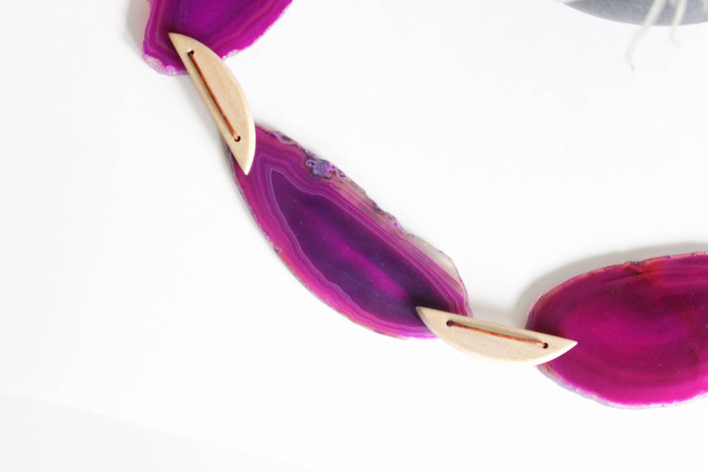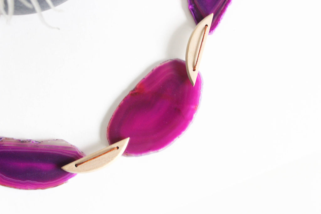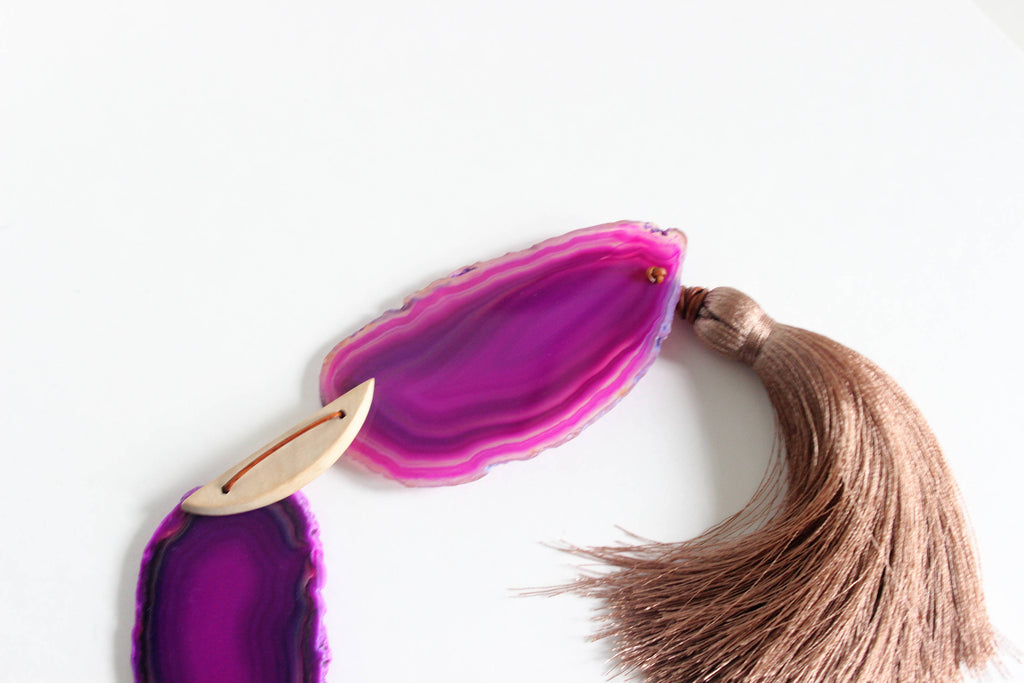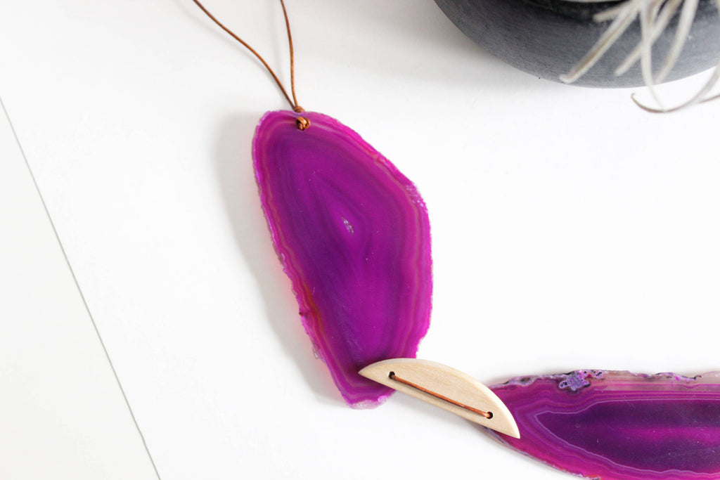 Materials: agate,wood,leather,agate slice,silk,pink,dark brown leather,distressed leather,pink agate,fuchsia agate,pink geode,pink crystal,FREE SHIPPING