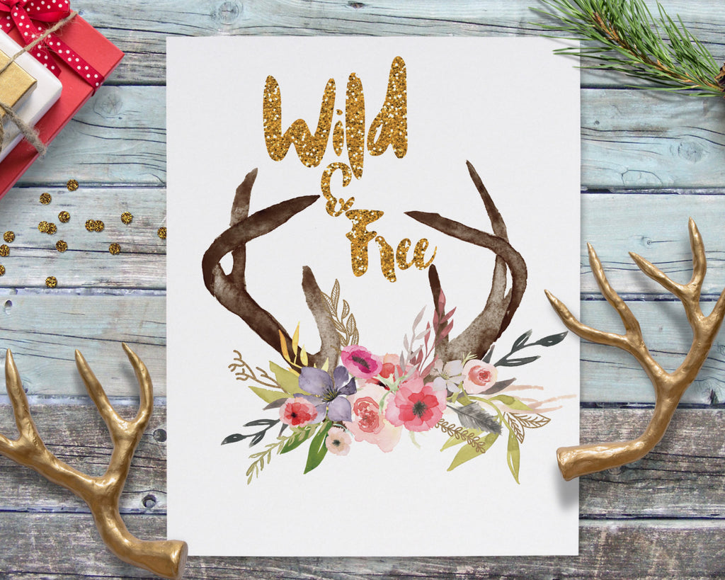 www.etsy.com/listing/473139759/printing-service-add-on-listing-for-anPrintable Wall Art Wild And Free Floral Deer Antlers, INSTANT DOWNLOAD Printable wall art, Flowers and Antlers, Gold Foil Look, glitter text
