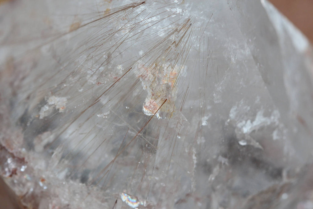 Large Rutilated Clear Quartz Point with raw sides and a polished tip as clear as glass.... when held in the sunlight, the rutile along with the rainbows make this piece a must have!