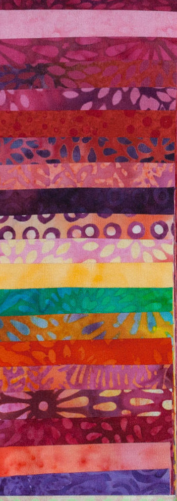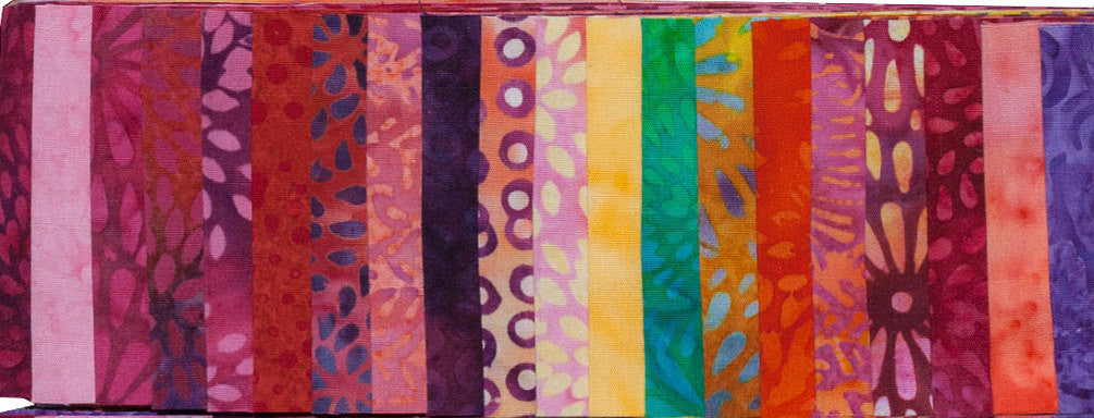 A bouquet of magenta, rose pinks, lavender and plum purples and warm oranges and yellows make up this pre-cut Batiks Layer Cake.