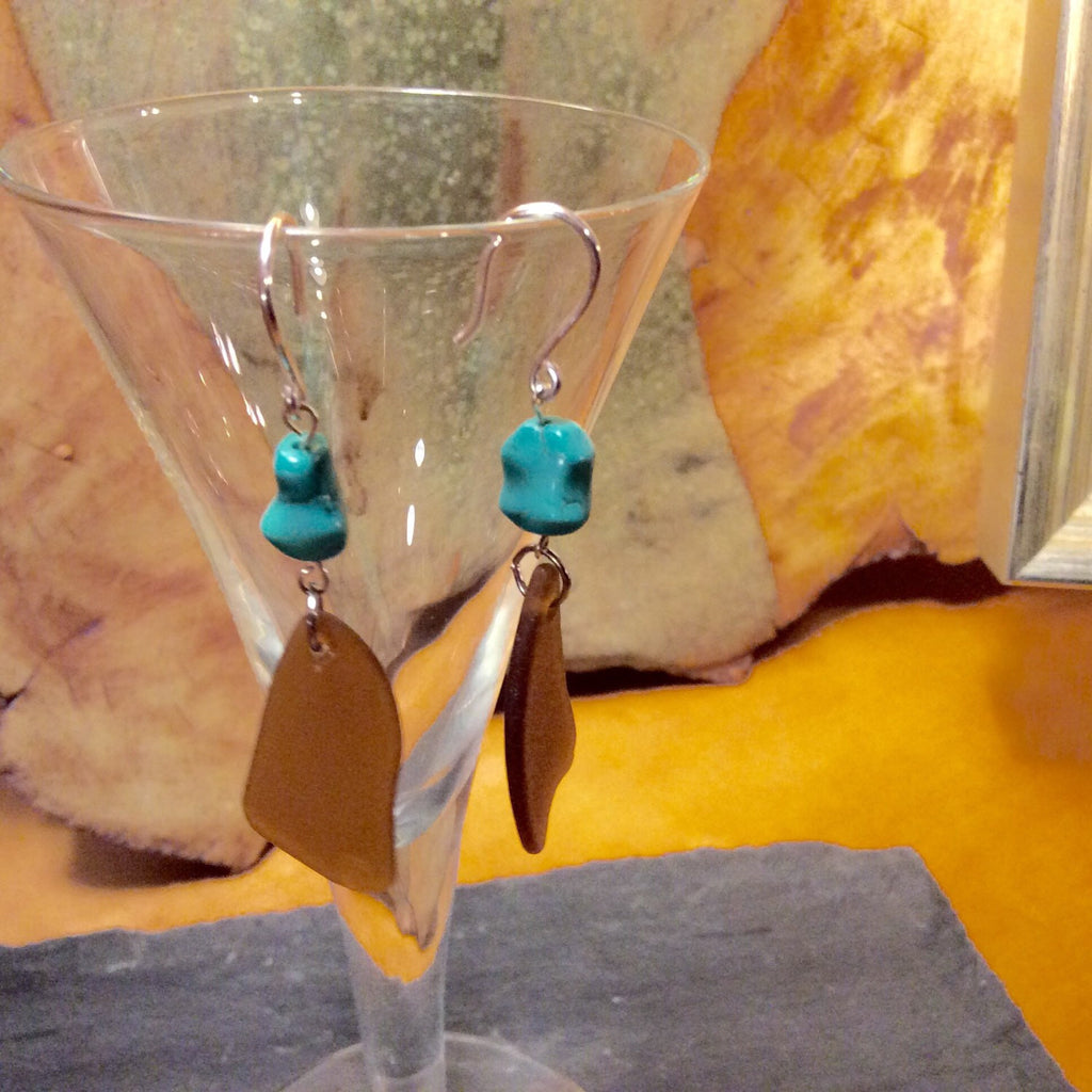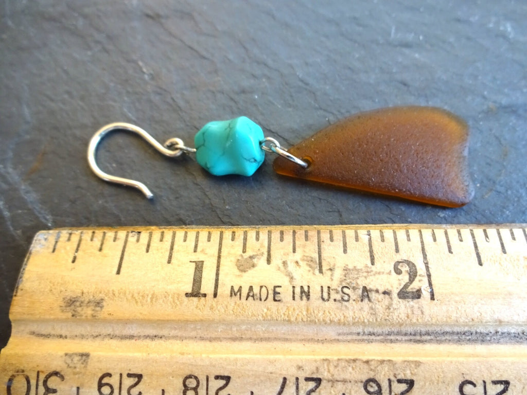 Sea Glass Earrings, Natural Turquoise Nugget Beads, Beach Earrings, Amber Sea Glass, Upcycled Sea Glass, Boho Earrings, SGE180