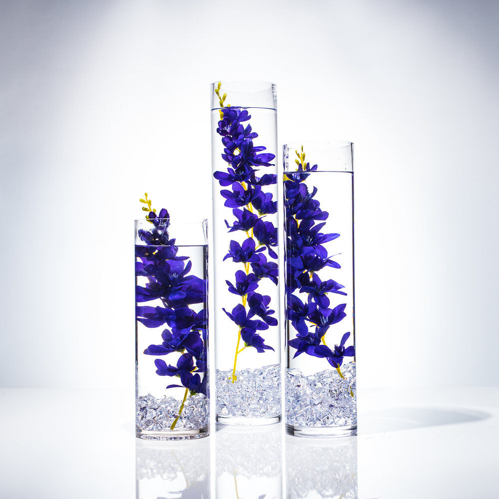 Materials: Silk Flowers,Silk Flower Centerpeice,silk flower water centerpiece,Floating Candle,Faux Flowers,Cherry Blossom,blue orchids,white orchids,white with purple orchids,Pink orchids,Silk Rose,Silk Wisteria,Purple Wisteria