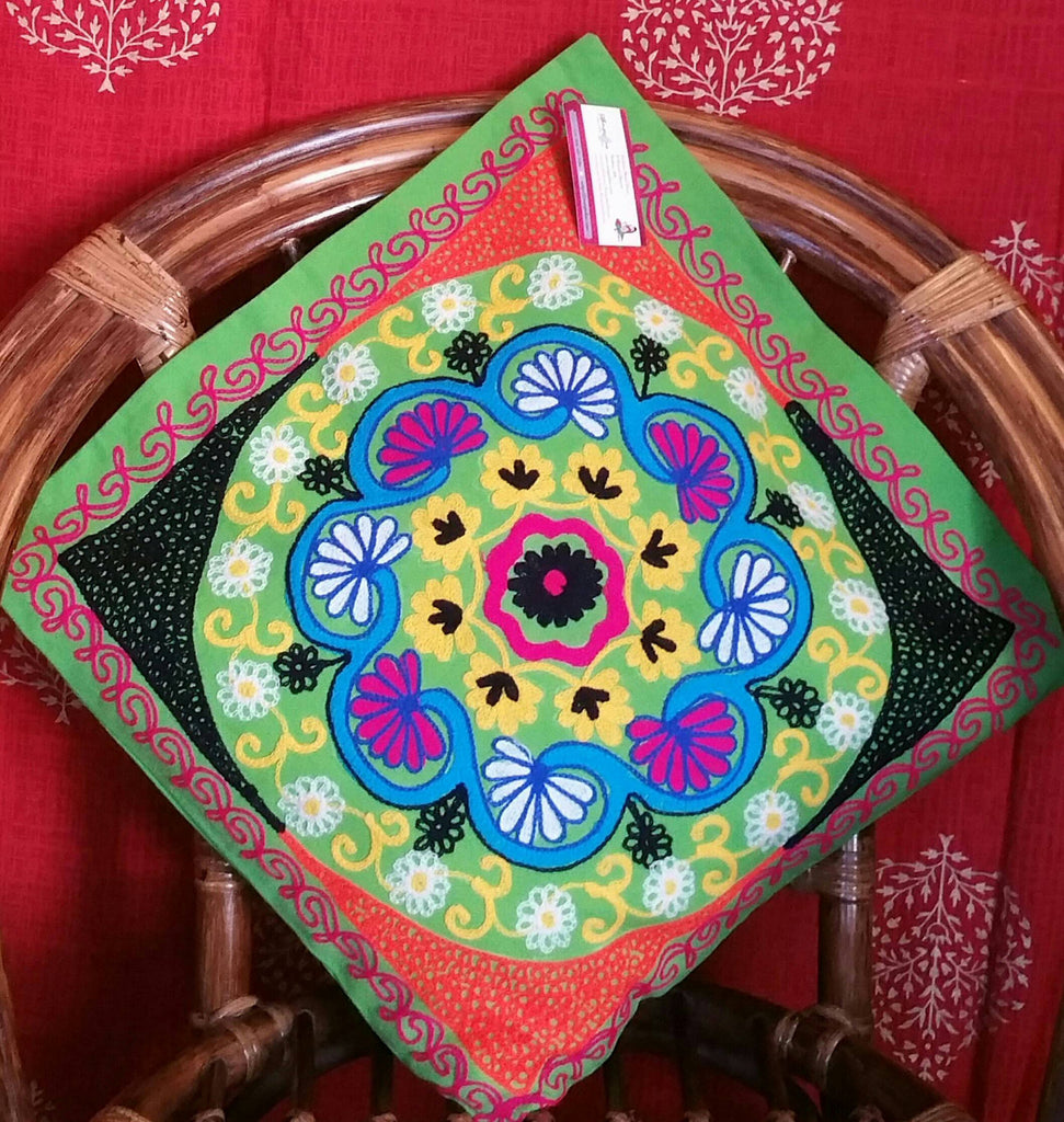 The cushion cover is made of Silk/Cotton/Wool embroidery on 100% thick Cotton fabric with cotton back cover. Due to Suzani covers being handmade, there might be some imperfections and pen marks as the unique patterns are drawn on the silk cover before being embroidered.