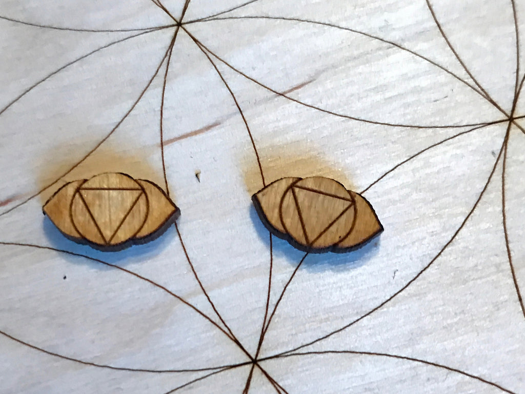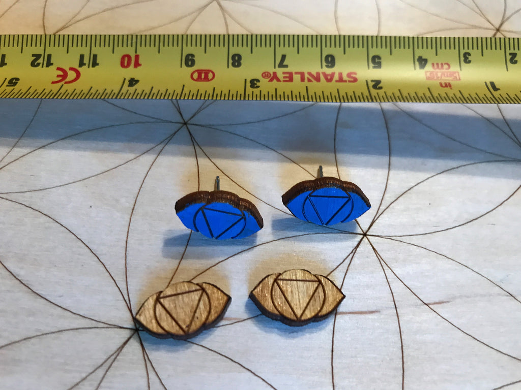 You may choose between blue painted or natural stained. These are cute wooden Third Eye chakra earrings. The posts and backs are nickel free. They are made out of birch wood. These earrings are made to order please allow up to 5 business days for production.