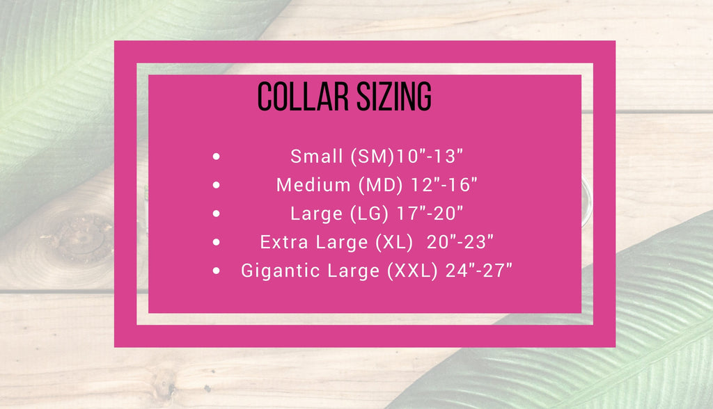 **********PLEASE READ THIS BEFORE ORDERING*********** PLEASE BE SURE TO MEASURE YOUR PET’S NECK WITH A MEASURING TAPE AND ADD 2” TO THAT MEASUREMENT FOR WIGGLE ROOM. FOR EXAMPLE: IF YOUR DOG MEASURES 12” ADD 2” TO THAT MEASUREMENT SO THAT BECOMES 14” AND YOU WOULD PICK A COLLAR WHERE THAT NUMBER LANDS IN THE MIDDLE. WE DO ACCEPT RETURNS/EXCHANGES HOWEVER THE BUYER WILL BE RESPONSIBLE FOR SHIPPING THE ITEMS BACK AND TO BE SHIPPED TO YOU- THERE WILL ALSO BE A RESTOCKING FEE OF 20% OF YOUR PURCHASED ITEMS.