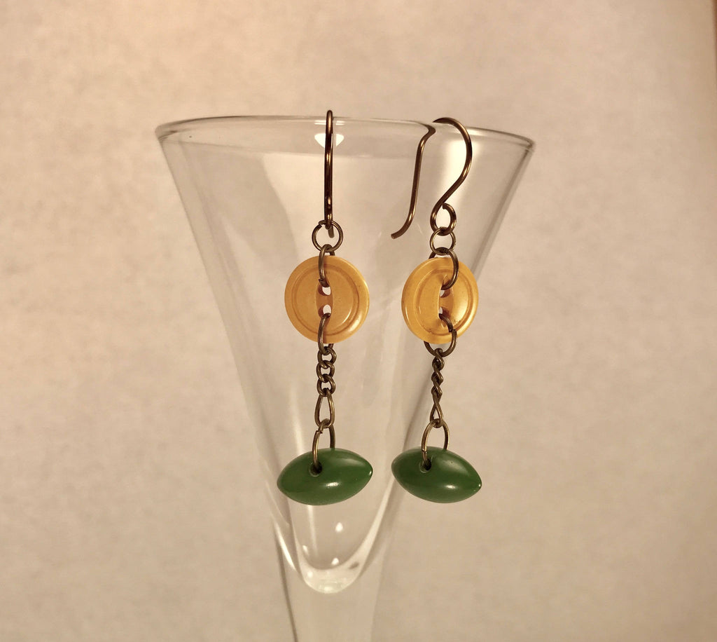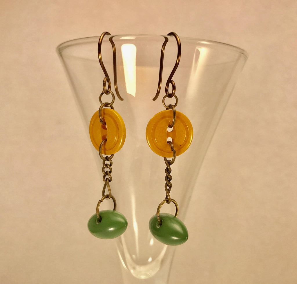 Here is a pair of fun, unique earrings made from two Bakelite buttons. These buttons were purchased together and demanded to stay together, like siblings. The football shaped green buttons are so unique. The earrings are constructed with antique brass colored wire. and brass chain. The buttons are in excellent condition considering their age. The earrings measure 1 3/4" from top to bottom.