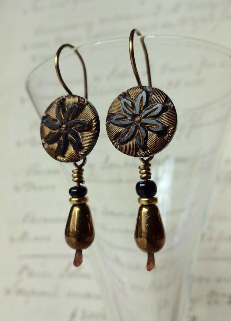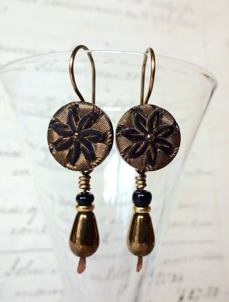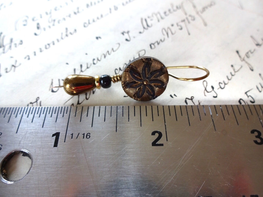 Lovely vintage black glass button earrings with gold luster detail in a flower patterns embellished with bronze teardrop, black, and gold bead drops. These earrings are a bit less than 1 3/4" long.