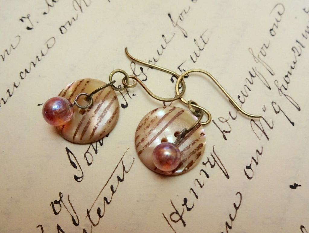 Vintage Button Earrings, Mother of Pearl MOP Buttons, Pink Beads, Layered Button Earrings, Antique Glass Beads, Handmade Earrings