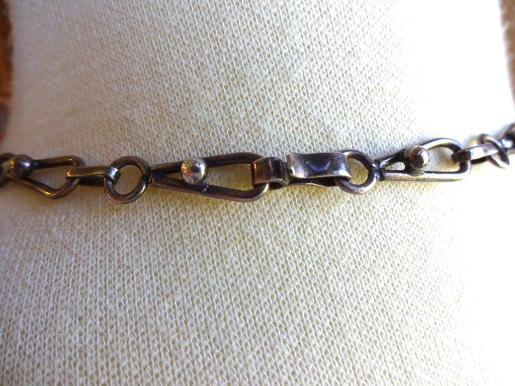 Here we have a sweet handmade pendant composed of a vintage black pierced flower button superimposed on a vintage mother of pearl button. The pendant is suspended on a vintage handmade oxidized sterling silver chain in a very interesting, unusual pattern with a bead detail. If you like the pendant but don't like the chain I can switch it out with another chain. Just ask. The pendant is 1 3/8" and the chain is 17".