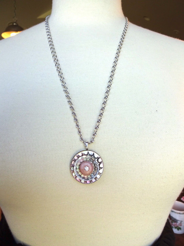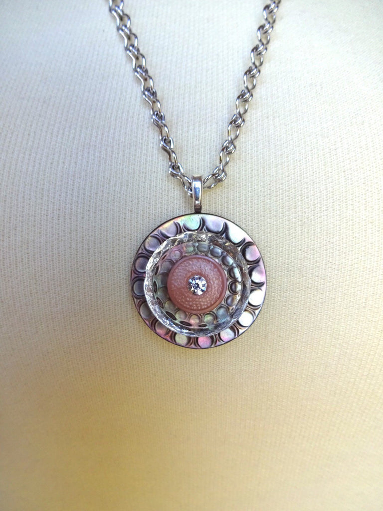 This is a layered dark carved mother of pearl MOP button, glass button, and pink rhinestone button pendant necklace. I started with a 1 1/4" dark carved rosy mother of pearl button and layered on a 1" clear glass button. I topped it off with a pink casein rhinestone button. I hung the pendant on another vintage piece, a Sara Coventry silver plated chain, 24" long. The result is a beautiful layered button necklace you will be proud to wear or give as a gift.