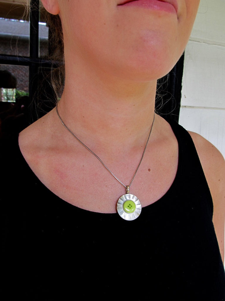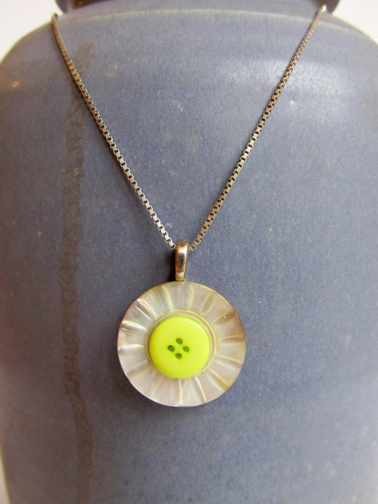 Here is a fun, funky necklace with vintage carved mother of pearl button handmade pendant with a lime green button accent. Its a very cheery combo! The pendant is 1" across. It is suspended on a an oxidized sterling silver 16" chain. The oxidized chain and pendant bail accent the darker tones in the MOP button.