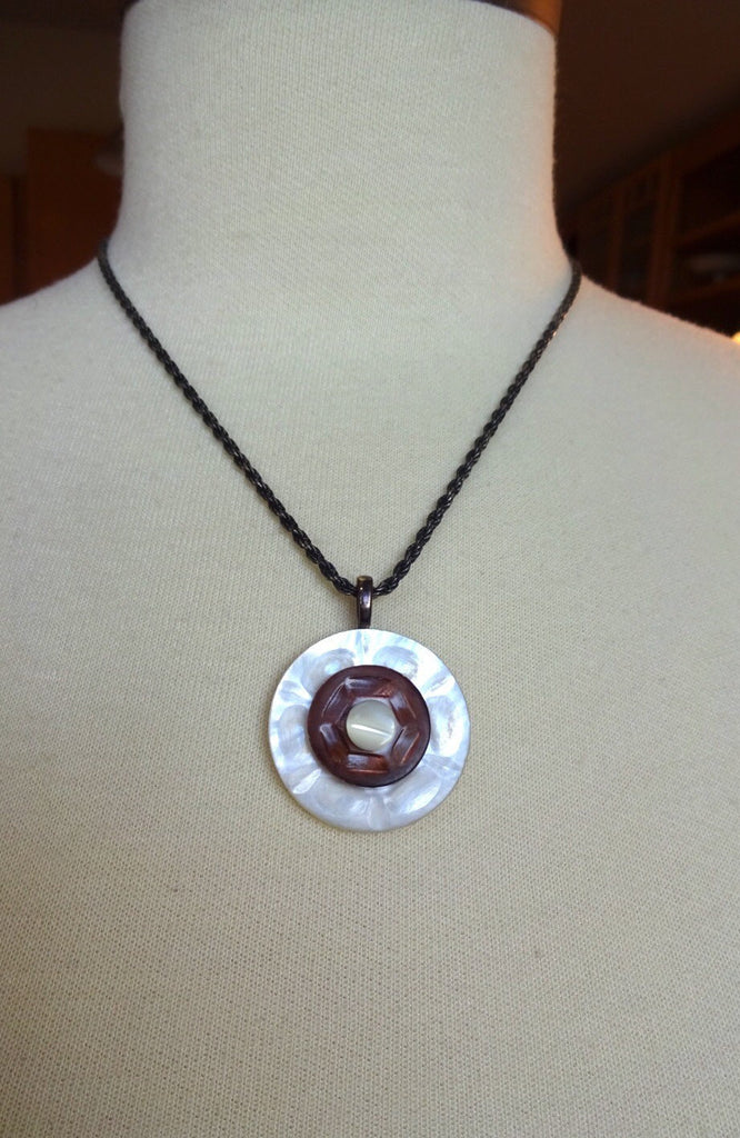 Here is a layered mother of pearl vintage carved MOP button pendant necklace. I started with a 1 1/4" white carved button and added a brick red antique MOP button, also carved. I topped it off with a simple small white blouse button. I hung the buttons on another vintage piece, a sturdy oxidized sterling silver rope chain. The result is a beautiful layered button necklace you will be proud to wear or give as a gift.