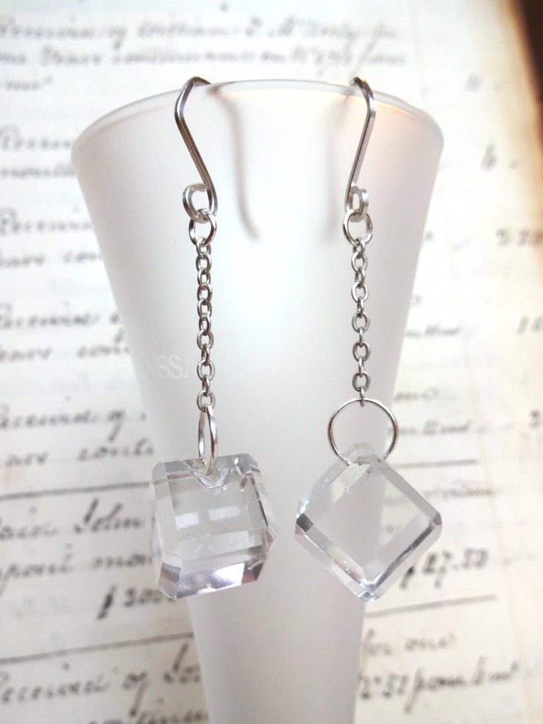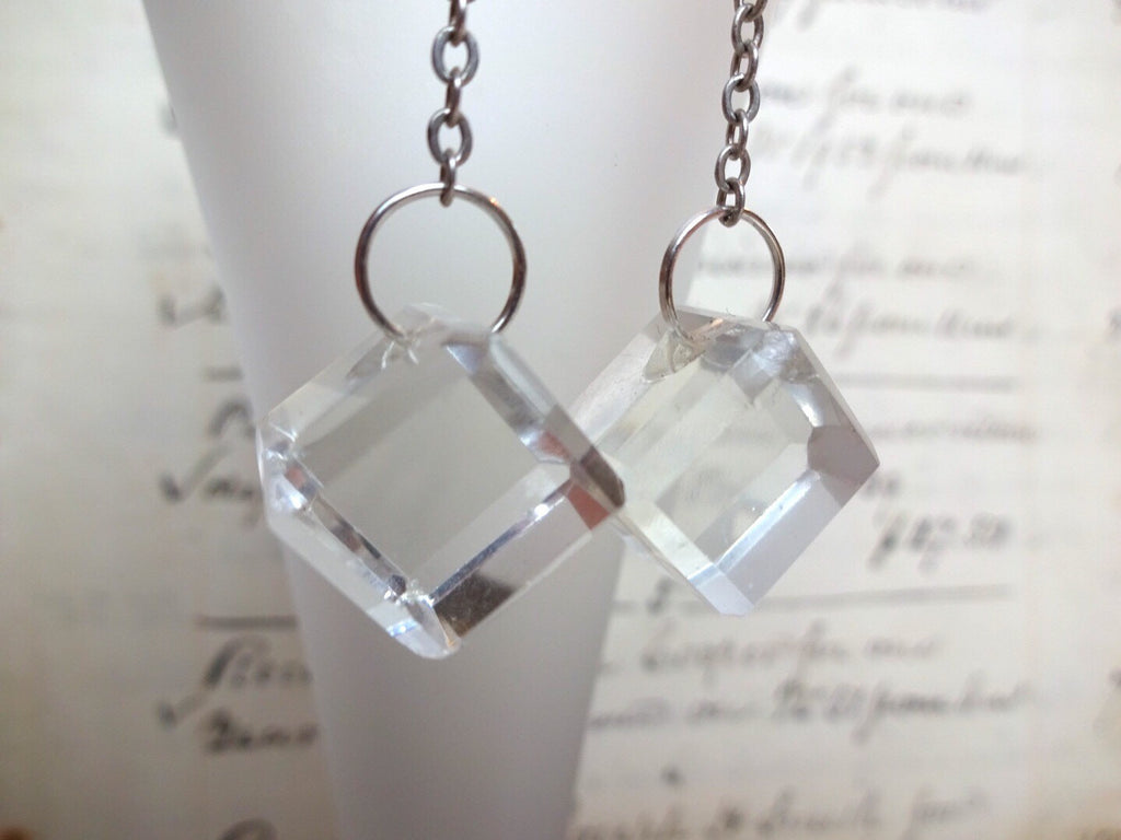 Vintage Clear Glass Button Earrings, Antique Buttons, Square Geometric Earrings, Glass Buttons, Handmade Dangle Drop Earrings, CGE149