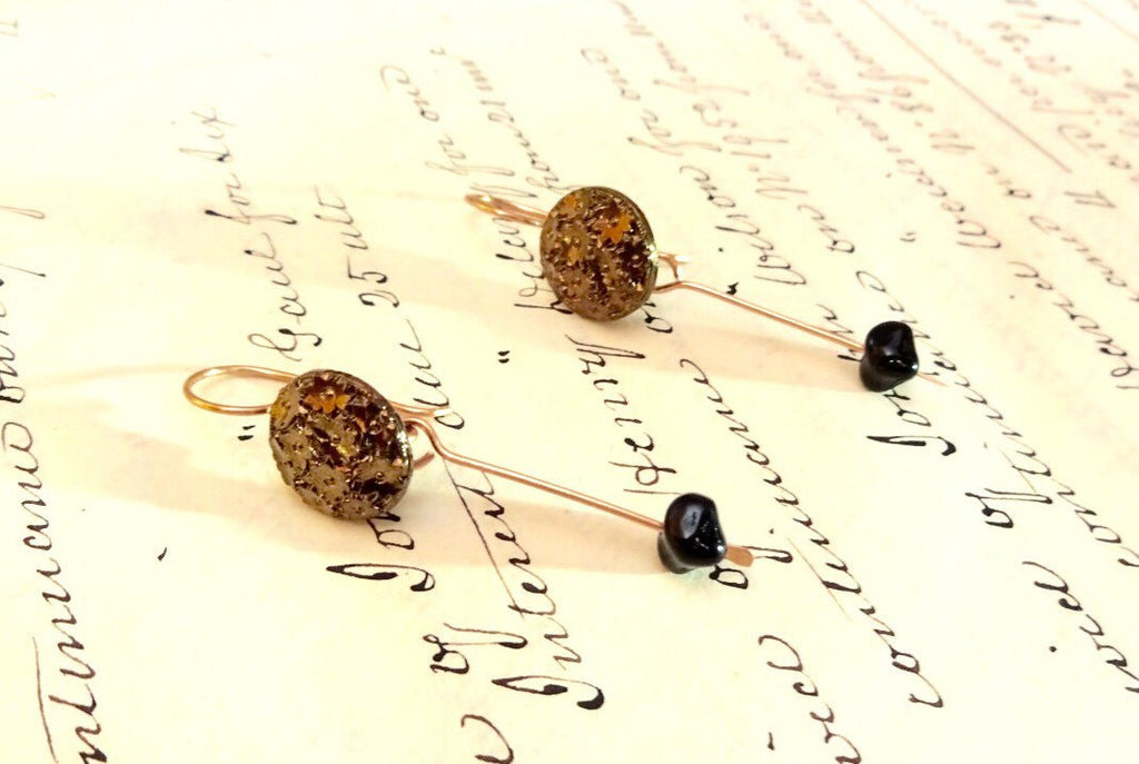 Vintage Copper Button Earrings, Vintage Copper Luster, Black Glass Buttons, Black Bead Drops, Copper Ear Wires