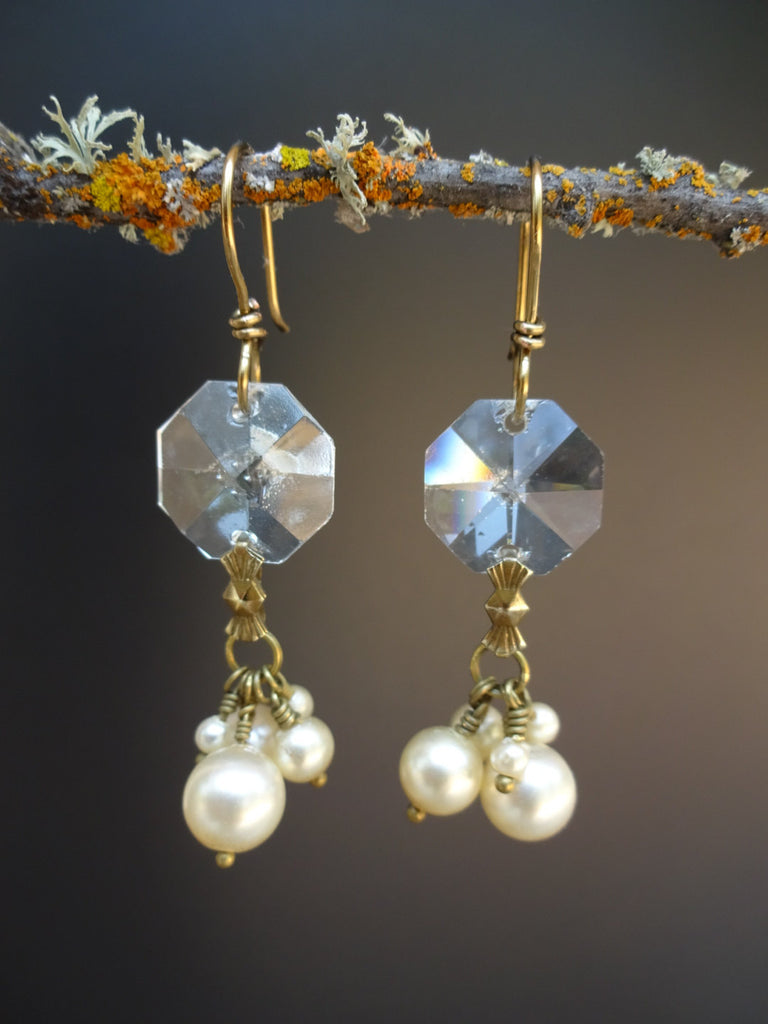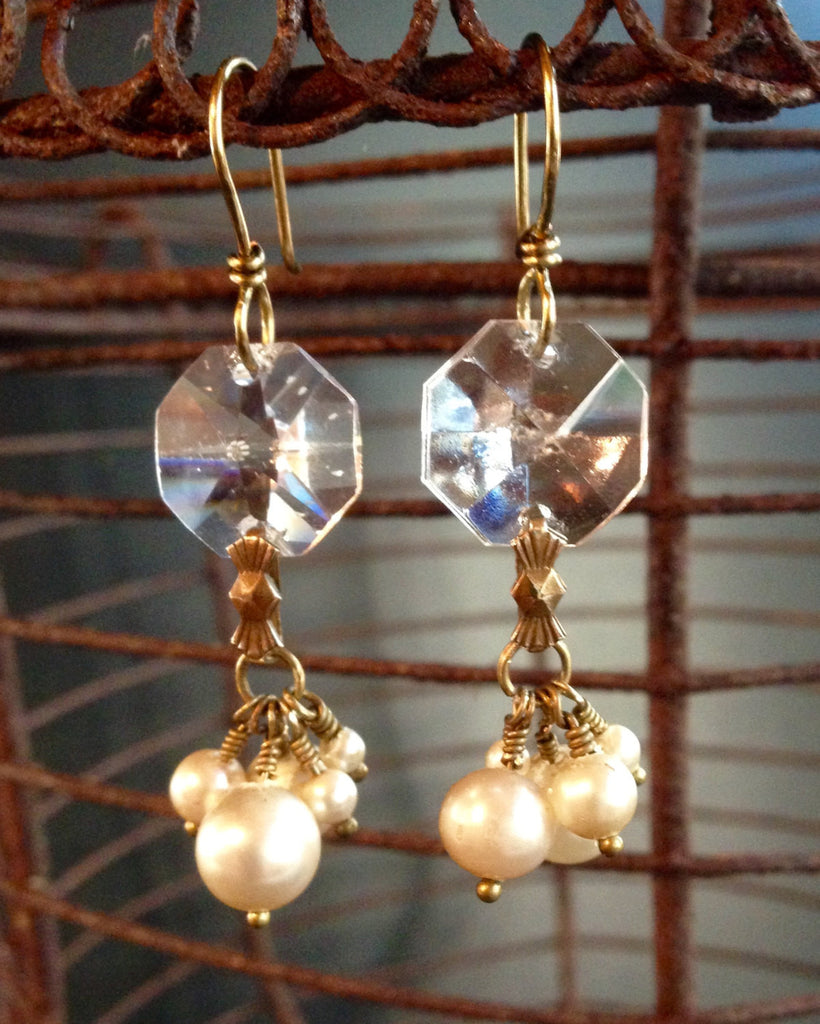 Here is a pair of handmade earrings featuring Vintage chandelier crystals and old faux glass pearl clusters. They are constructed with antique brass colored copper ear wires. Between the crystals and the pearls is a sweet little brass connector that was also a detail from the chandelier. The earrings are 2 1/4" long. They are lovely and unique.