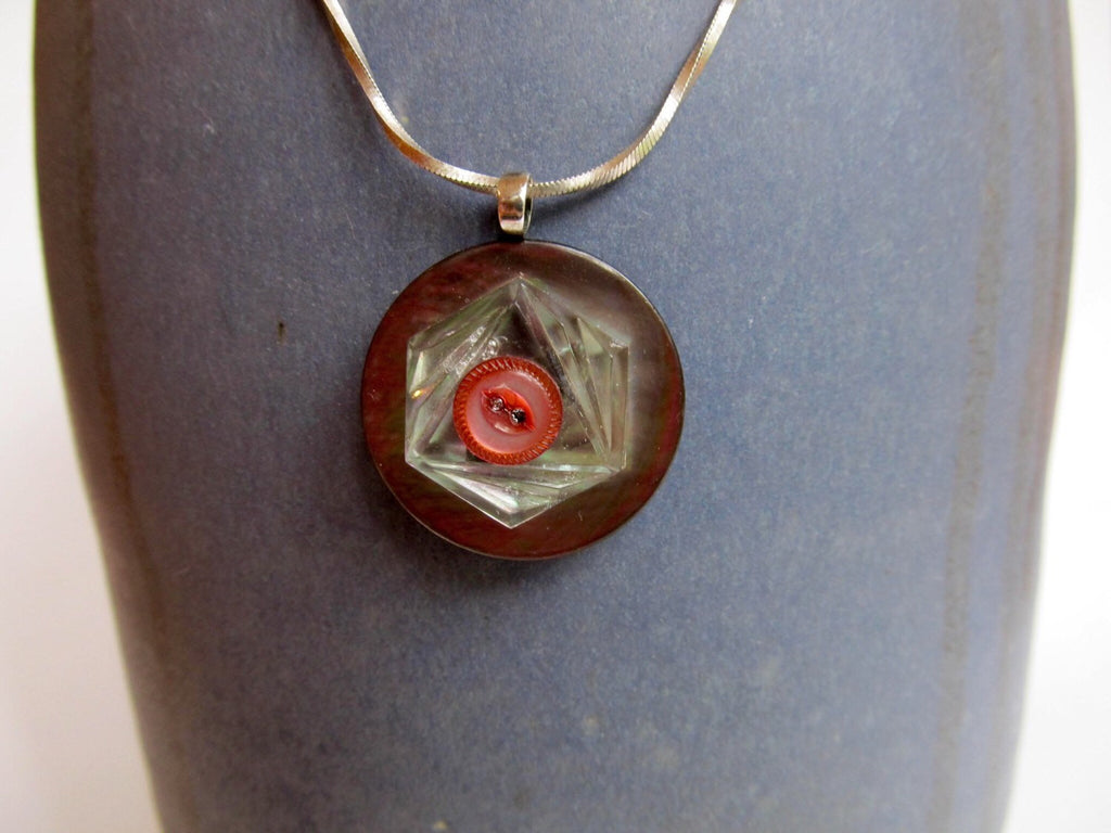 Antique Cut Glass Button & Mother of Pearl Button Pendant Necklace, Red Accent Button, Vintage 23" Sterling Silver Chain, Twist Snake Chain. This MOP pendant necklace began with three vintage buttons. A dark smoky mother of pearl button with lots of red iridescence serves as the base with a smaller cut glass button with a triangle pattern incised on it, then topped with a red accent button. I really like the combination. The pendant is suspended on a beautiful twisted sterling silver box chain that is 23" long. The pendant is 1 1/4".
