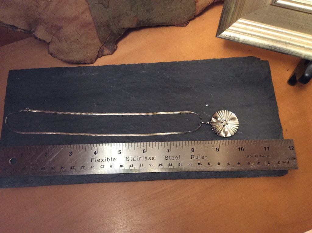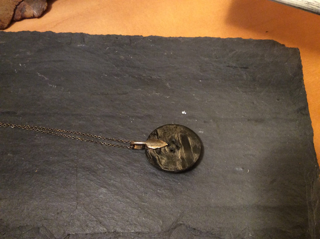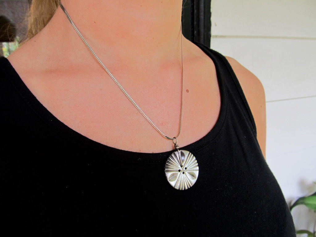 Here is a vintage carved smoky mother of pearl pendant necklace, simply hand wired and hung on a vintage sterling silver chain which has been oxidized to continue that vintage look. The button is deeply carved with radiating lines and leaf pattern. This is one of those beautiful vintage buttons that doesn't need embellishment. It shines with smooth silky iridescence in shades of blue, green and rosy purple. The button is 1 1/2" in diameter and the chain is 17" long.