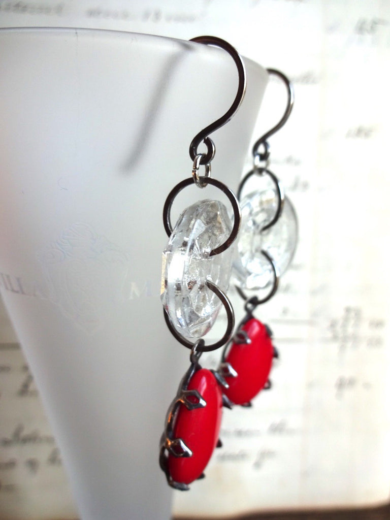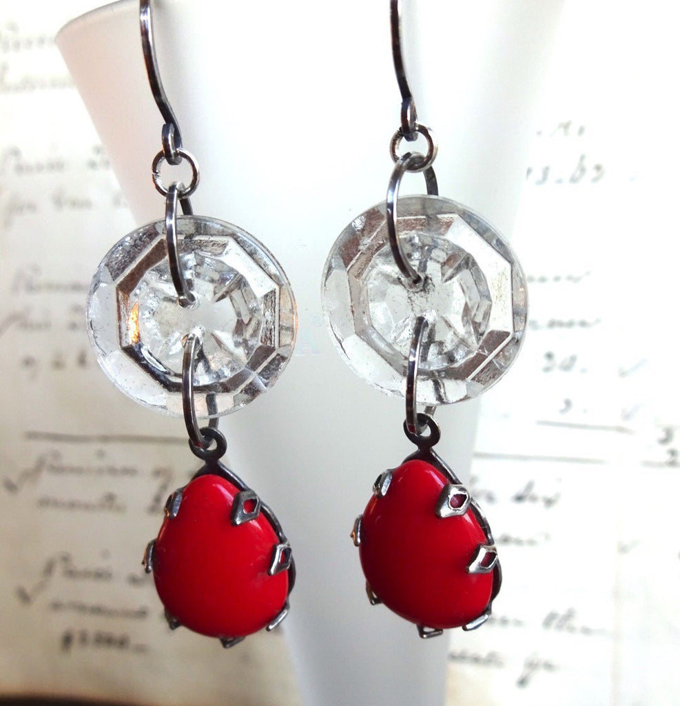 Here's a pair of vintage clear glass buttons paired with these beautiful lipstick red glass teardrop beads. The earrings are constructed with square silver filled ear wires. 2 1/2" long. I antiqued the finish on these to emphasize the vintage qualities of the button and drop beads. They are very festive and bright!